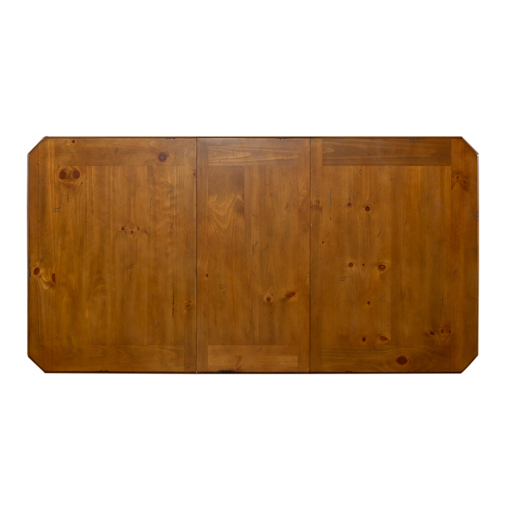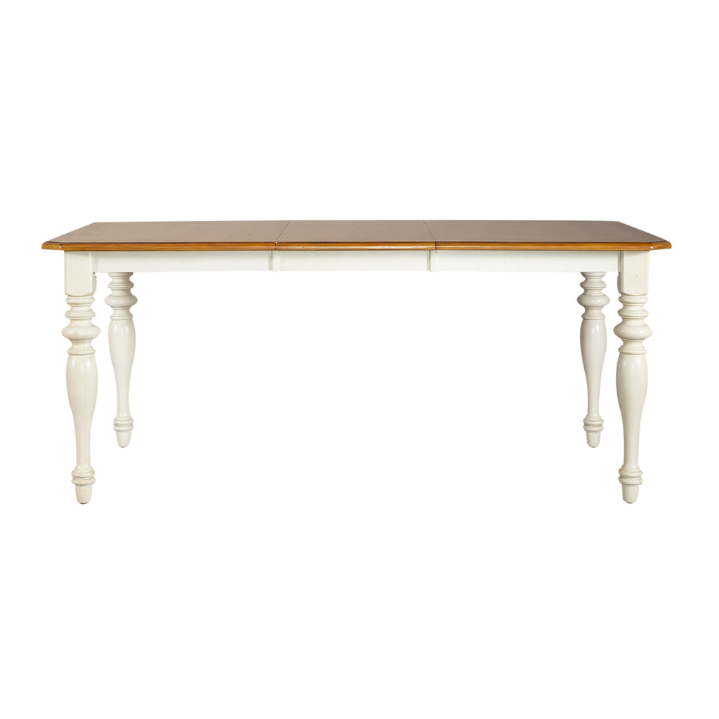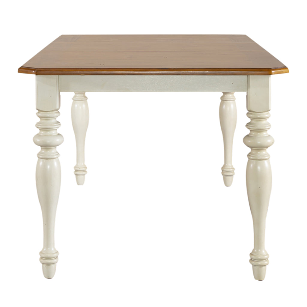 Gather around the Ocean Isle rectangular leg table. Crafted of rubberwood solids with pine veneers, this piece features a bisque finish with natural pine, one 18-inch removable leaf, canted corners, pine veneer top, a two-toned finish and is anchored by heavily turned legs. This piece is available in alternate finishes, sure to be a great addition to any home. Elegantly styled and casually proportioned, this table works in a dining room or kitchen dining combination effortlessly.