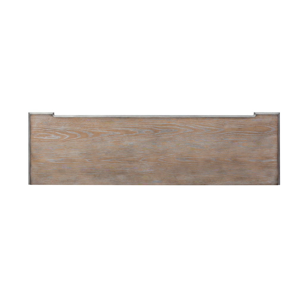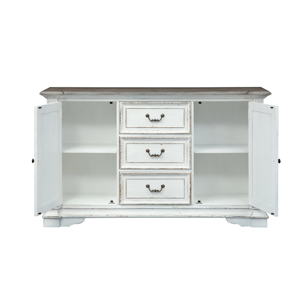 It’s never been easier to be elegant with the Abbey Park buffet. Crafted of poplar solids and cathedral white oak veneers, this piece features an antique white finish with heavy chipping and a weathered brown with whitewash top, accented with antique pewter bail pull and knob hardware. This buffet has two doors and three drawers with raised panel drawer fronts and solid framed molding. The top drawer has premium felt lining. The shaped corners flow into chamfered pilasters with a fluted top. Blending of European traditional design influences makes Abbey Park a truly unique style for any living space.