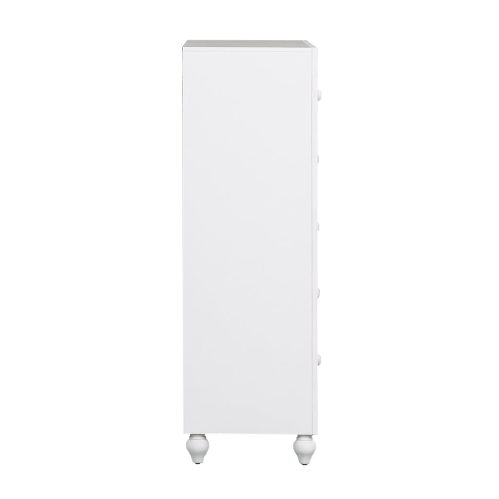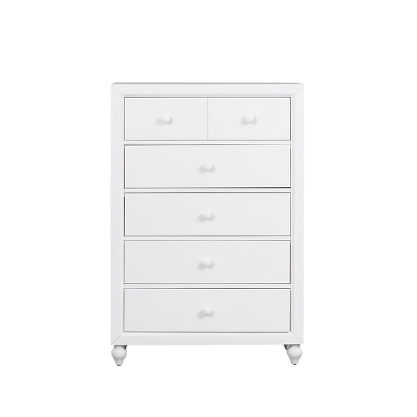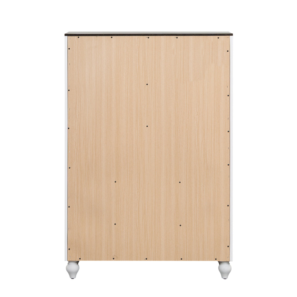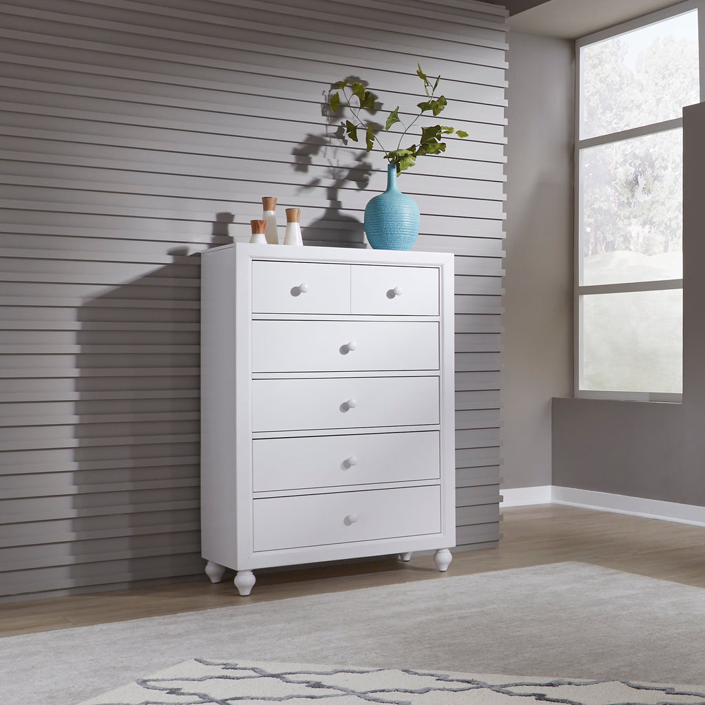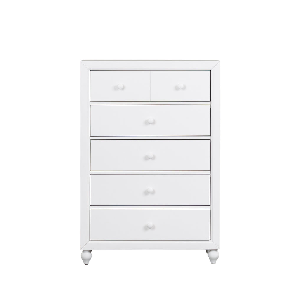 Indulge in cottage design with the Cottage View 5 drawer chest. Crafted by melamine and a rubberwood solid frame, this piece features a clean white finish, kenlin drawer glides, bottom case dust proofing, a laminate drawer interior, bluff cut top drawers, solid wood picture framed molding, bun feet, and is acented by wood knob hardware. This piece is available in an alternate finish and the melamine is scratch resistant, sure to make this piece last in any home.