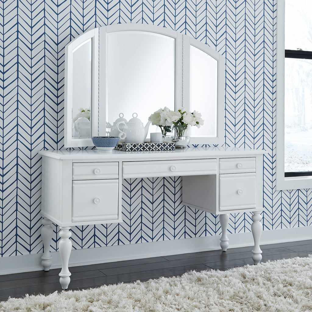 Add to your fashionable cottage look with the Summer House mirror. This piece features a timeless oyster white finish and a tri fold mirror, sure to catch every angle!