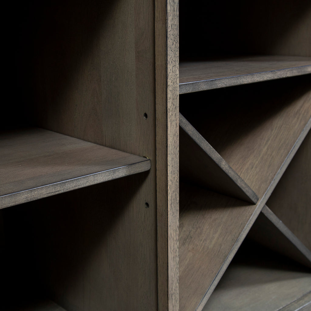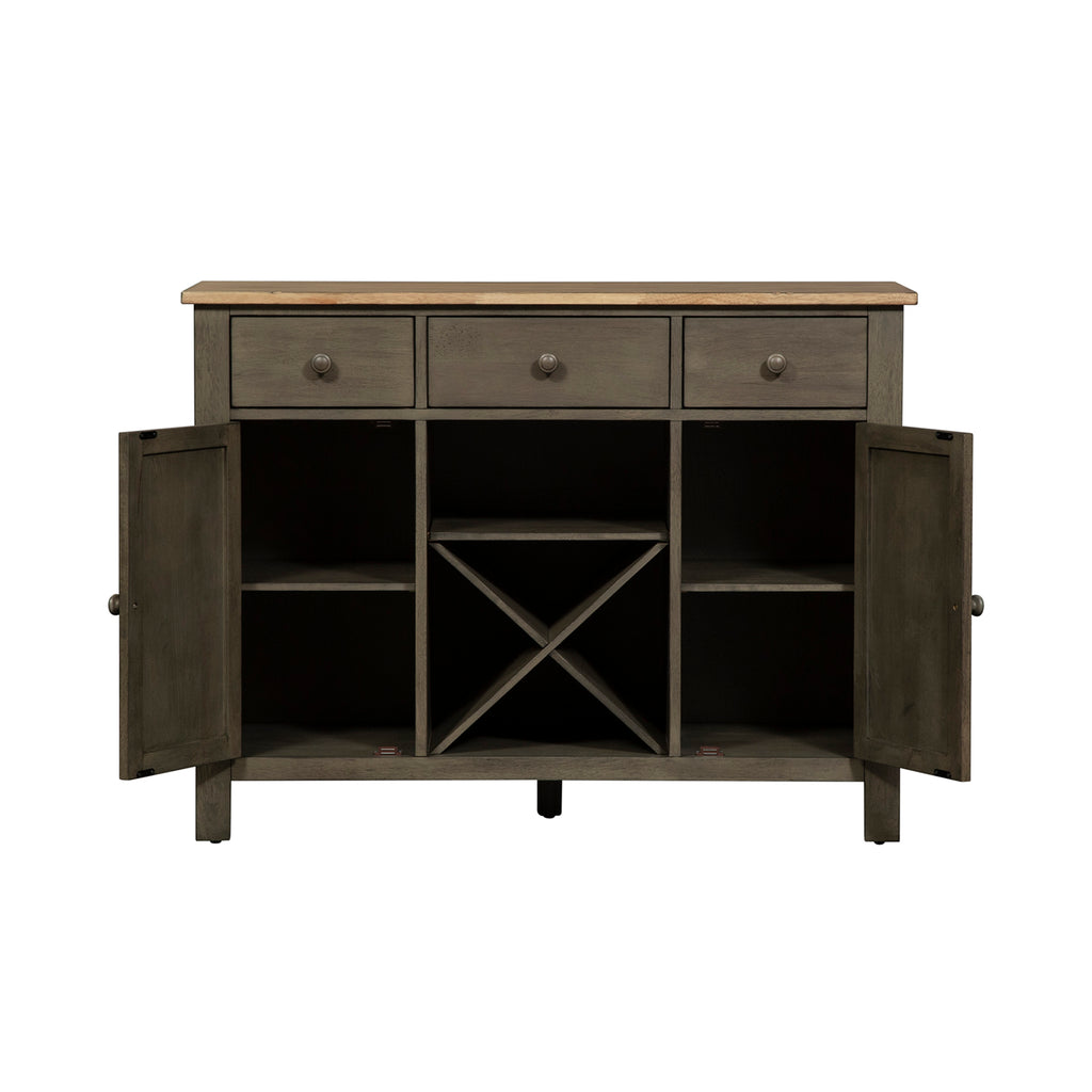 Invite a classic look with a casual feel into your home with the Lindsey Farm server. Crafted of rubberwood solids and veneers with MDF, this piece features a gray and sandstone finish, inverted v design on both doors, levelers to protect your flooring and adjust the height, three drawers accented with gray wood knob hardware, one adjustable shelf behind each door, and removeable x shaped wine shelving. This piece has an alternate finish and offers a look that compliments today's homes with style uncompromised.