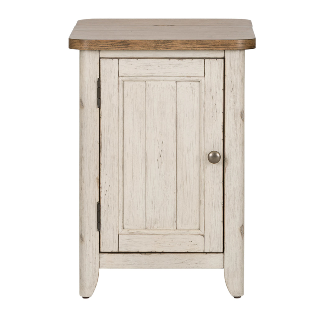 Morning coffee just got better with the Farmhouse Reimagined door chair side table to set your coffee cup on. Crafted of pine and poplar solids with pine and cathedral hickory veneers, this piece features an antique white finish with a chestnut top, appealing brass knob hardware and wood framed planked door, additional storage with one adjustable shelf behind the door, flip-lid section on top that reveals power supply of 3 receptacles and 2 USB ports, anchored by a softly rounded pilasters with tapered feet. This gorgeous farmhouse side table would make a great addition to any space.