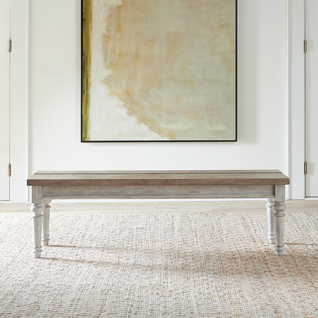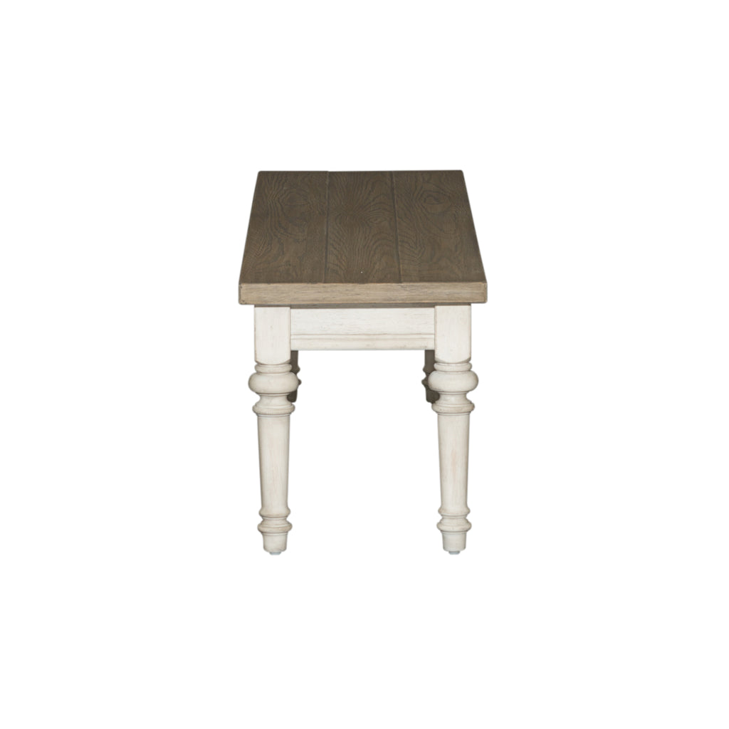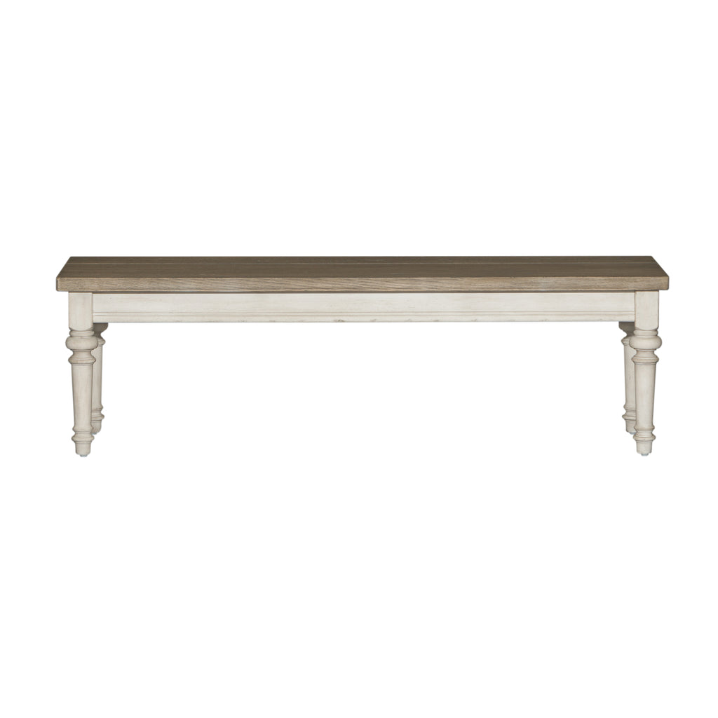 Sit in comfort and style with the Heartland bench. Crafted of rubberwood solids, this piece features an antique white finish with a tobacco top, bead molding along the apron, and is anchored by heavily turned front legs. The seat features an interesting high/low plank effect, setting this piece apart from others, and offers versatile cottage styles you love in a heavily distressed finish that will work from the beach to the mountains to an industrial loft.