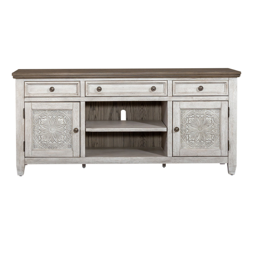 Accent your living room with the perfect vintage design, using this unique and stylish 66" tile tv console. Crafted of rubberwood solids and cathedral white oak veneers, this piece accommodates most 72" TVs and features an antique white finish with tobacco tops, three drawers, planked tops, full extension drawer glides for easy access to storage, two reversable/interchangeable decorative door panels, making this piece customizable, and is accented by timeless antiqued brass knob hardware. With today's modern technology in mind, users can enjoy the convenience of the open compartment areas and wire management provisions to hide those pesky wires from your electronics or gaming equipment.
