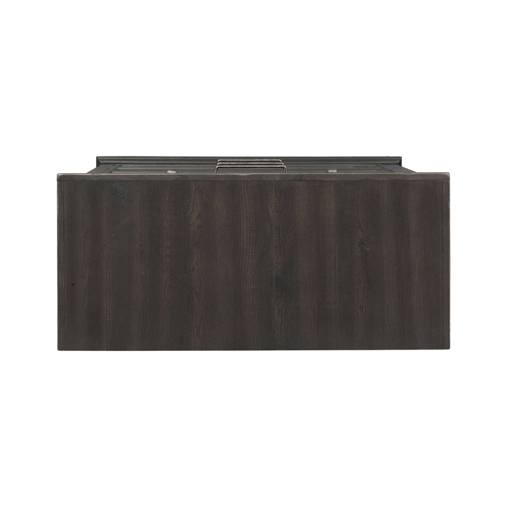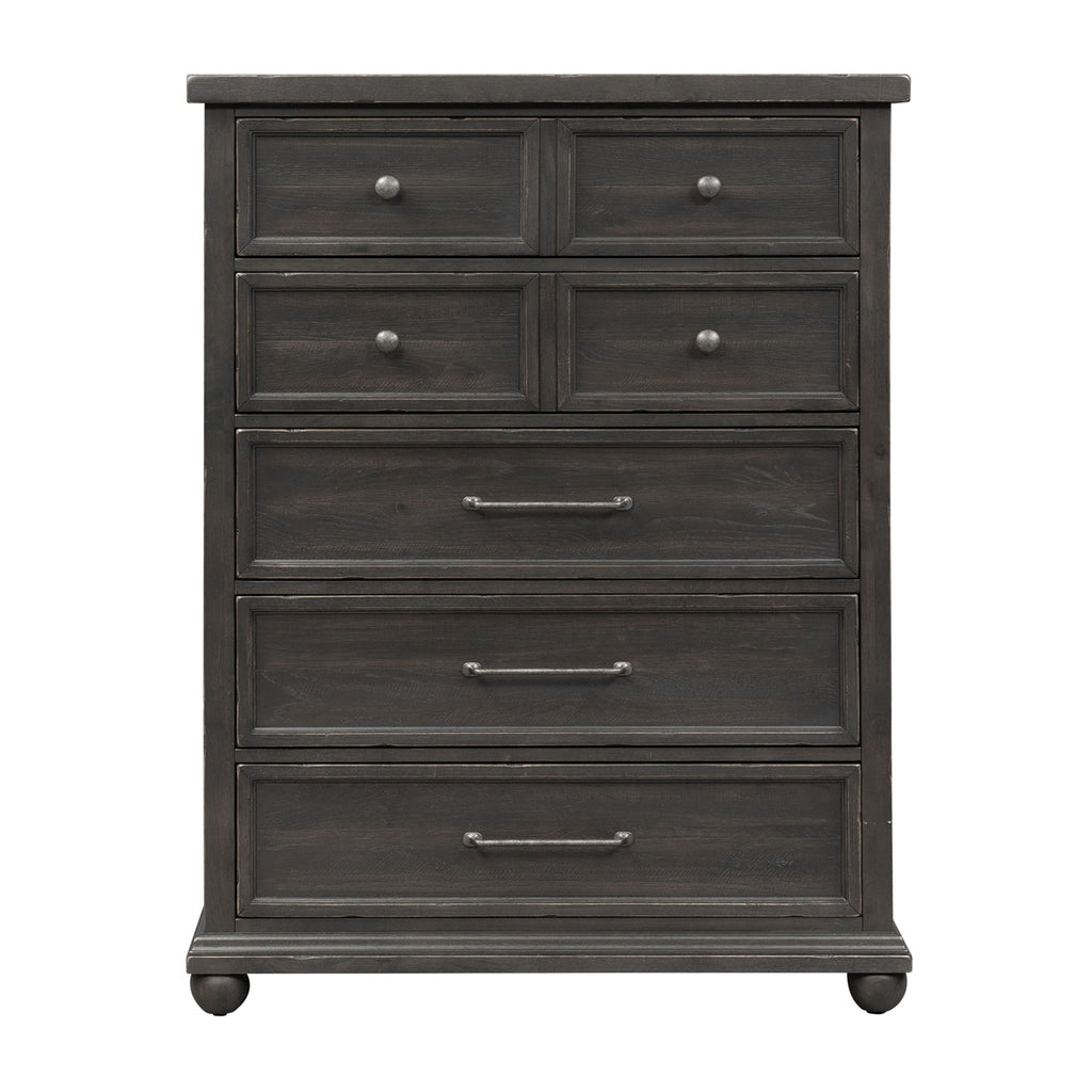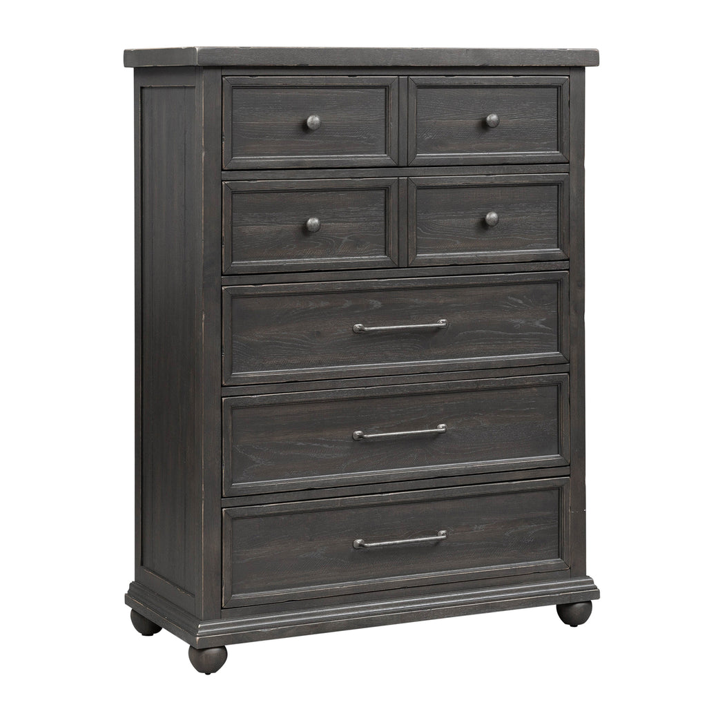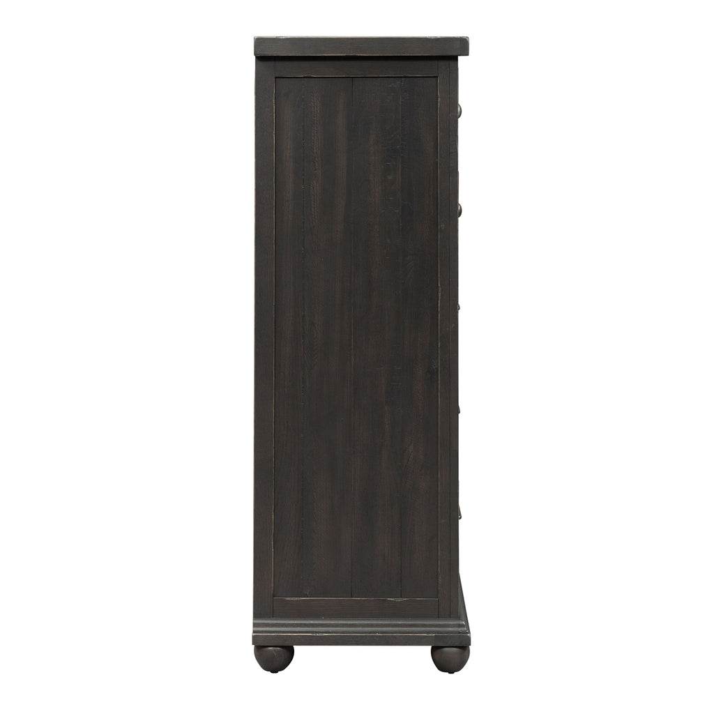 Add a vintage feel to your bedroom with this timeless Harvest Home chest. Constructed with rubberwood solids and knotty white oak veneers, this piece features a unique chalkboard finish, cedar lined bottom drawer, fully stained interior drawers, and bottom case dustproofing, all accented by antique brass bar pull and knob hardware.