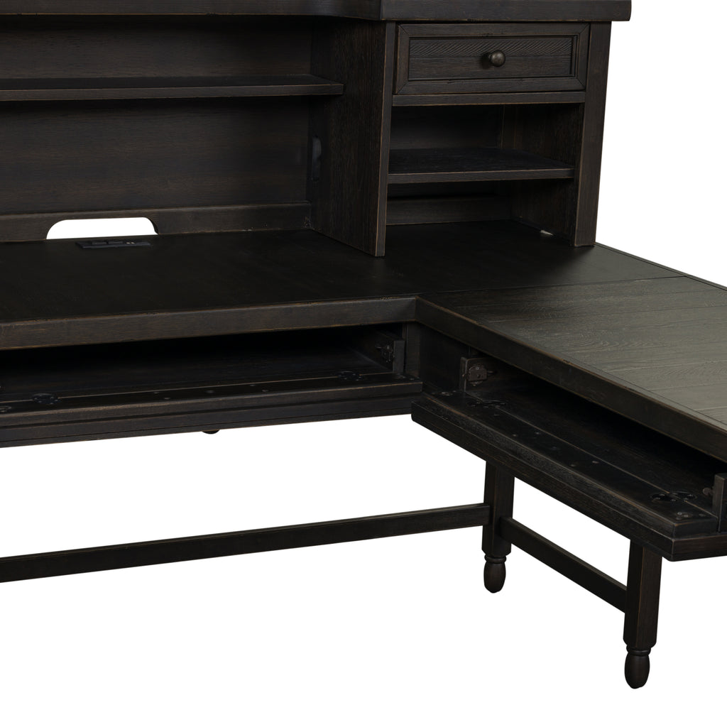 Crafted of rubberwood solids with knotty white oak veneers, features a chalkboard finish with saw cut hewing. Offer one full extension flip down keyboard drawer with a rounded corner and open shelf concept with bun feet. Cannot stand alone. Pair with the writing desk base and top to make a complete “L” shaped desk.