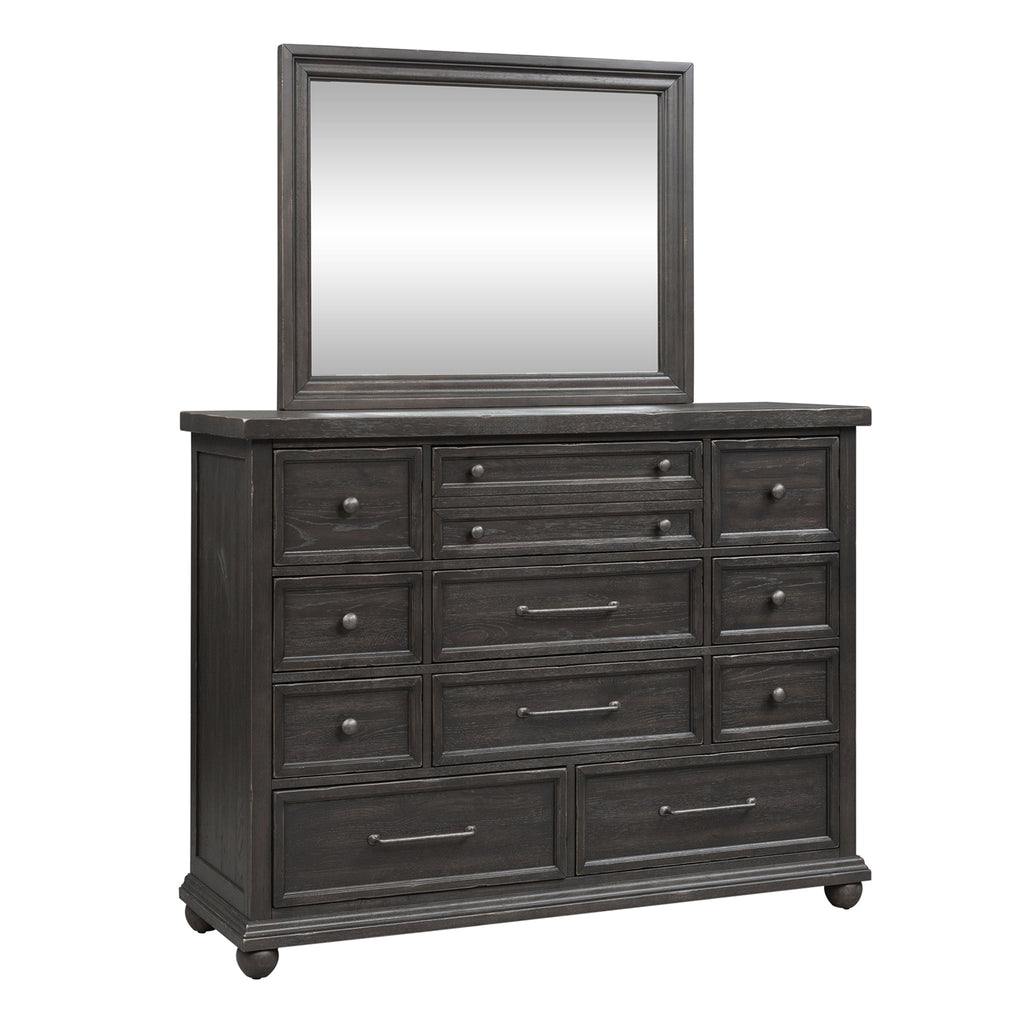 Enhance your home with the Harvest Home Dresser and mirror. Crafted of rubberwood solids and knotty white oak veneers, this kit features a chalkboard finish, full extension drawers with premium felt lined top drawers and cedar lined bottom drawers, thick butcher block style tops with a solid wood edge, planked accents, and is accented with antique pewter bar pull and knob hardware. The dresser offers abundant storage with its eleven drawers and pairs well with the landscape mirror that features a decorative wood frame and a 1” beveled edge and is secured by bolt-on supports. Add this classic bedroom kit to your casual space.