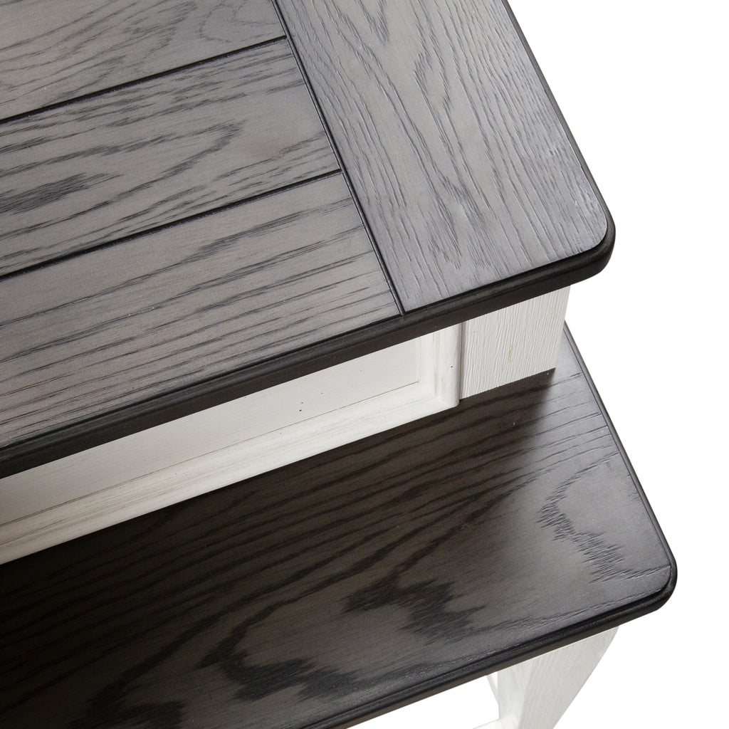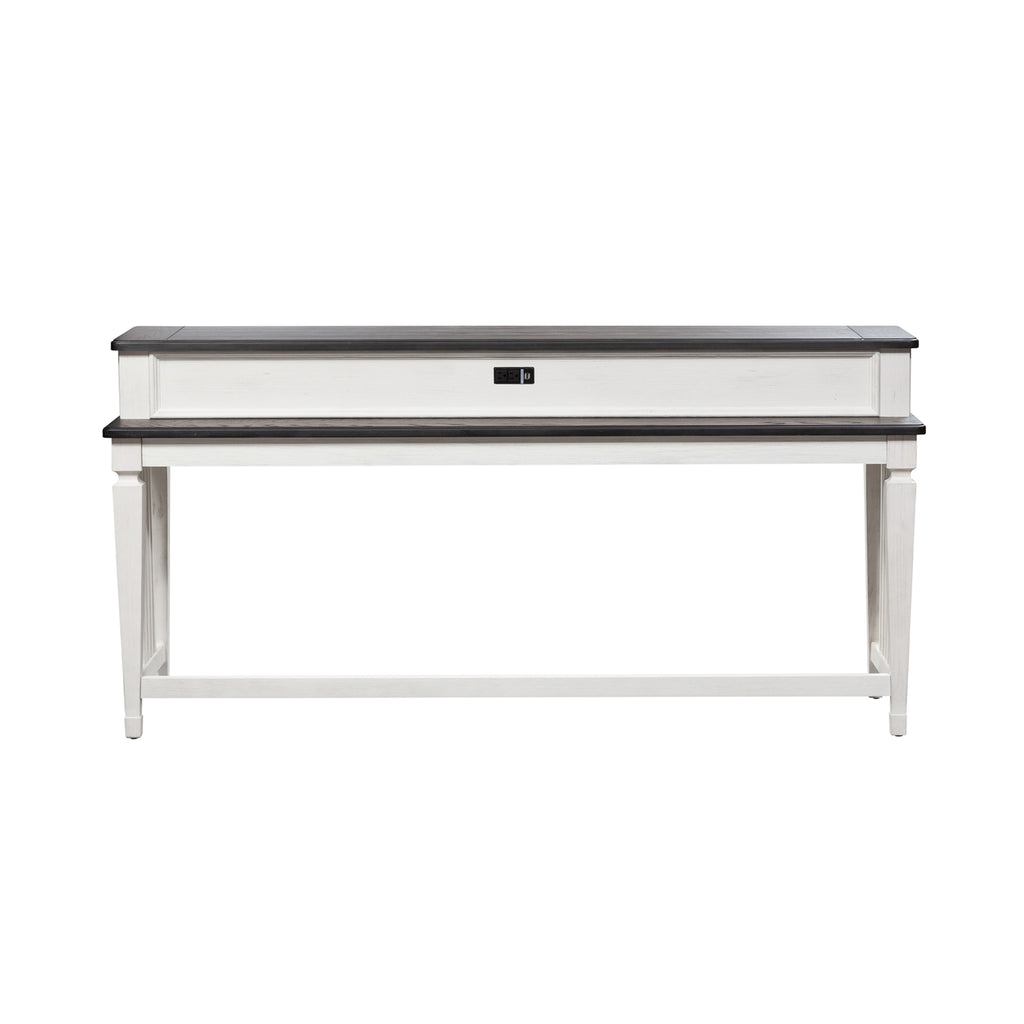 Elevate your space with the Allyson Park console bar table. Crafted of pine solids and veneers with cathedral white oak tops, this piece features a wire brushed white finish with a planked charcoal top, three storage cubbies, two electrical outlets and USB ports for easy access charging, and is anchored with square tapered legs and a slat style end panel. This classic console bar table would make a gorgeous addition to your casual styled home, perfect for behind your sofa.