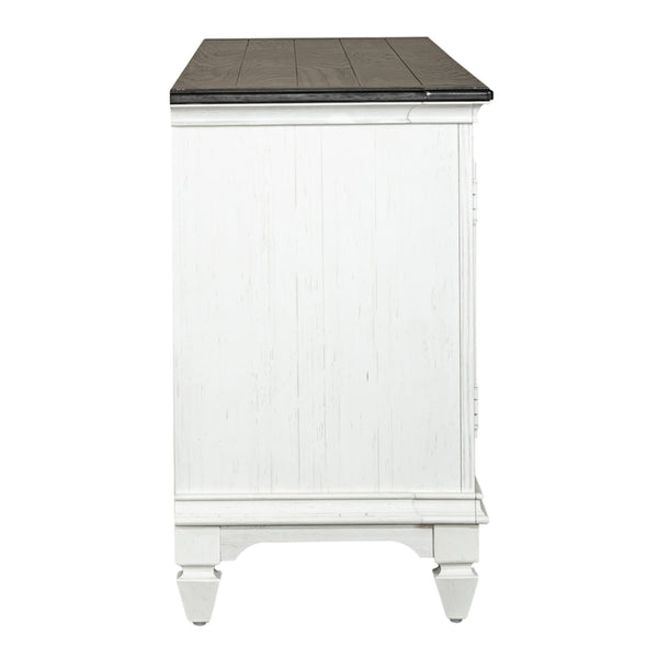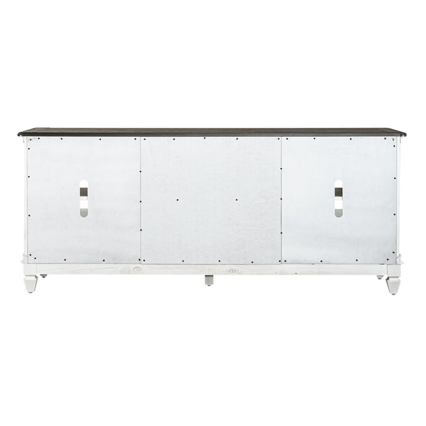 Indulge in a classic look and casual feel with the Allyson Park 72" tv stand. Crafted with pine solids and veneers with cathedral white oak tops, this piece features a wire brushed white finish with charcoal tops, antique pewter bail and knob hardware, adjustable shelving, planked tops, fully stained interior drawers, and beveled glass doors that allow controllers to work through the glass. This item can be used with the wall unit to complete the set, or stand-alone due to removeable magnetic return moldings and can accommodate most 80" TVs. Wire management provisions effortlessly accommodates a DVD player or gaming console of choice.