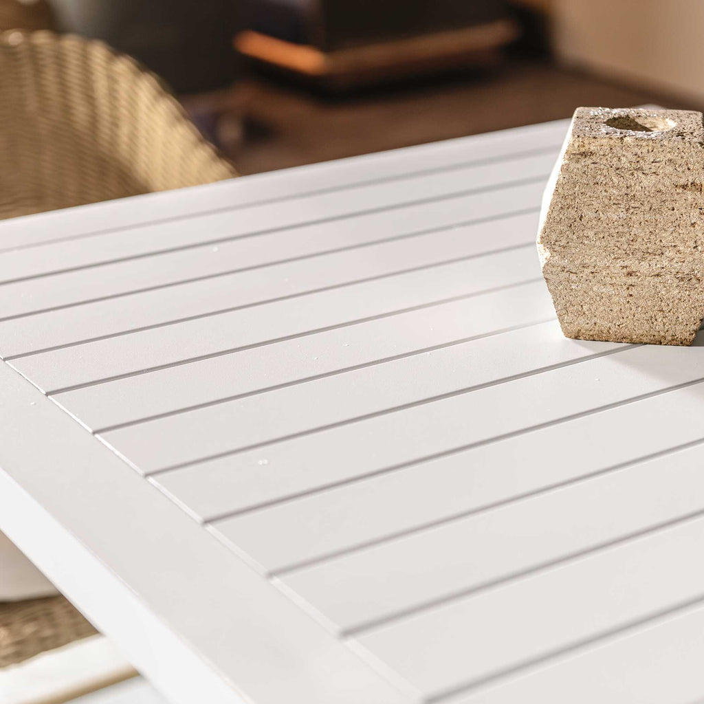 This Sleek And Stylish Bar Table Is Perfect For Outdoor Entertaining. The Minimalist Design Features A Square Top And A Geometric Support Structure For Stability, Made Of Aluminum In A Crisp White Finish.