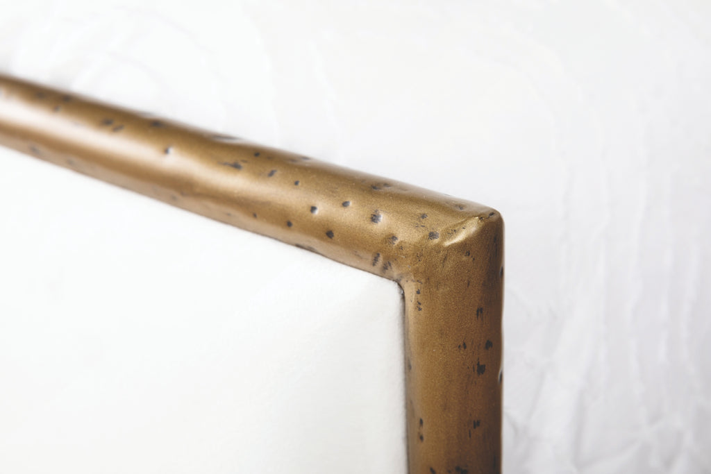 Accent your bedroom with the luxurious Royce Hammered Iron Upholstered Bed by Wesley Allen. Handcrafted by iron artisans, this upholstered bed is high-end and super sturdy, making it perfect for a lifetime of use. Customize your interior design style with over 30 upholstery options and three hammered iron finishes. The a one-piece fully welded headboard and footboard creates a luxurious family heirloom with a lifetime warranty. This bed is sure to become the centerpiece of your bedroom.