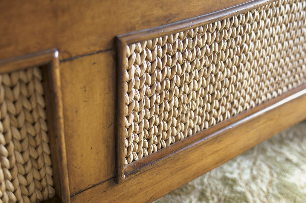 Using an intricate herringbone pattern of woven Lampakanai in the headboard and footboard makes a bold statement. Yet the design creates a soothing, restful retreat.