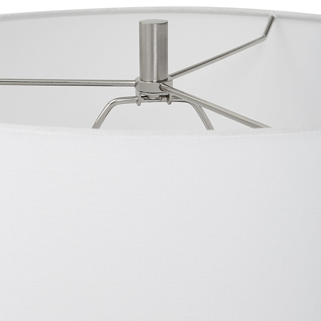 This Ceramic Table Lamp Features Eye-catching, Crudely Carved, Cobalt Glazed Stripes With Contrasting Ivory, Accented With Brushed Nickel Details. The Round Hardback Shade Is Covered In A White Fabric.