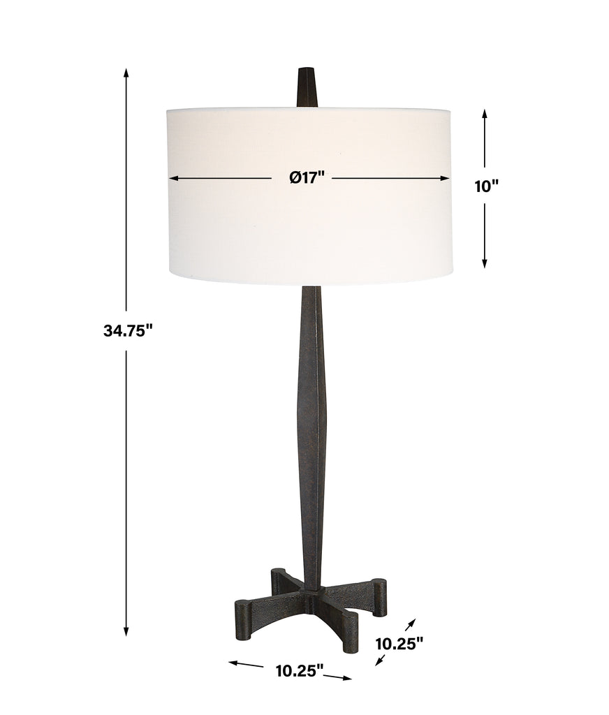Inspired By Classic Metalwork Designs, This Table Lamp Features A Tapered Base And An Industrial Inspired Foot Finished In Aged Black With Subtle Rust Distressing.