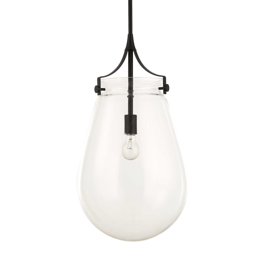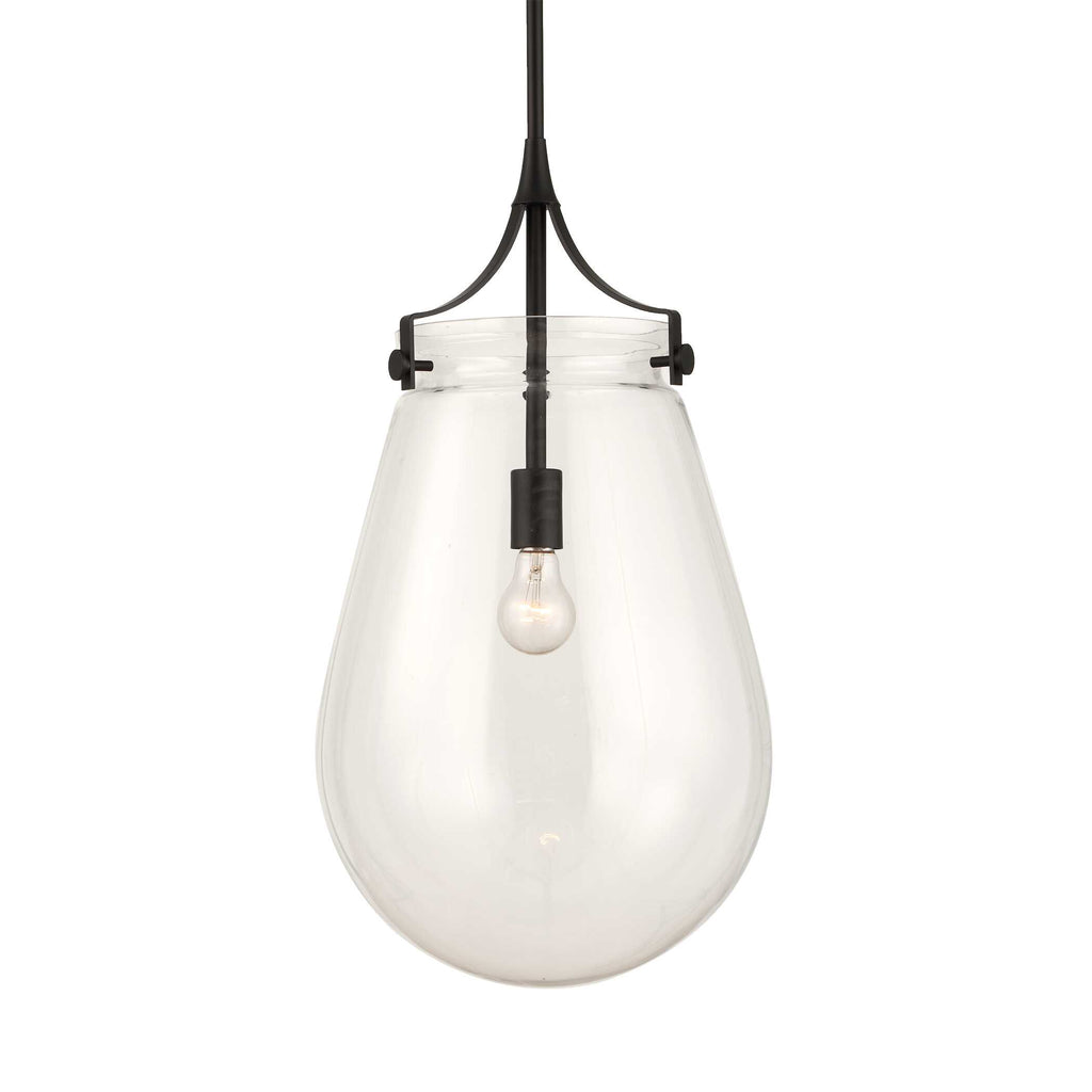 A Floating Oversized Clear Glass Pendant That Features Architectural Cone Draped Arms And Accents In A Rich Matte Black Finish. 1-60 Watt Max Edison Socket. Bulbs Not Included. Supplied With 15' Wire, 3-12" Stems And 1-6" Stem For Adjustable Installation.