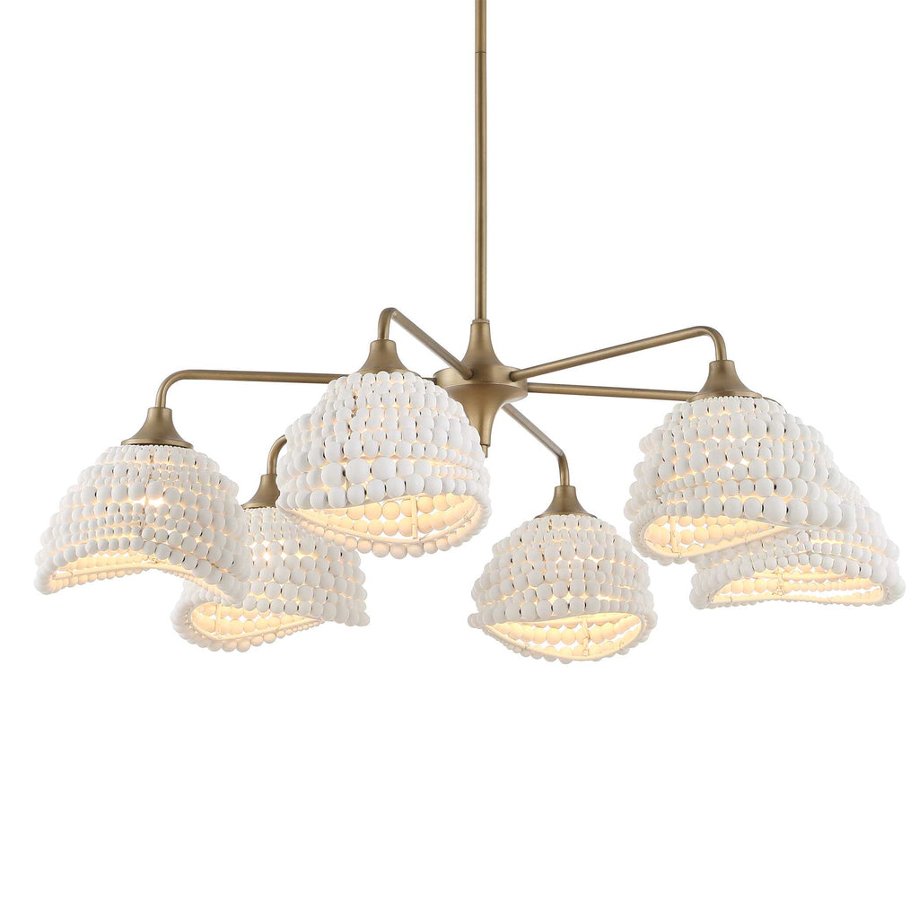 Our Refreshing 6 Lt. Pendant Features 6 Scalloped Shades Made Up Of A Variety Of 7 Sizes Of Intermingled Matte White Wood Beads Completed With A Brushed Matte Gold Finish Giving An Airy Inviting Feeling To Any Interior. 6-60 Watt Max Edison Sockets. Bulbs Not Included. Supplied With 15' Wire, 3-12" Stems And 1-6" Stem For Adjustable Installation.