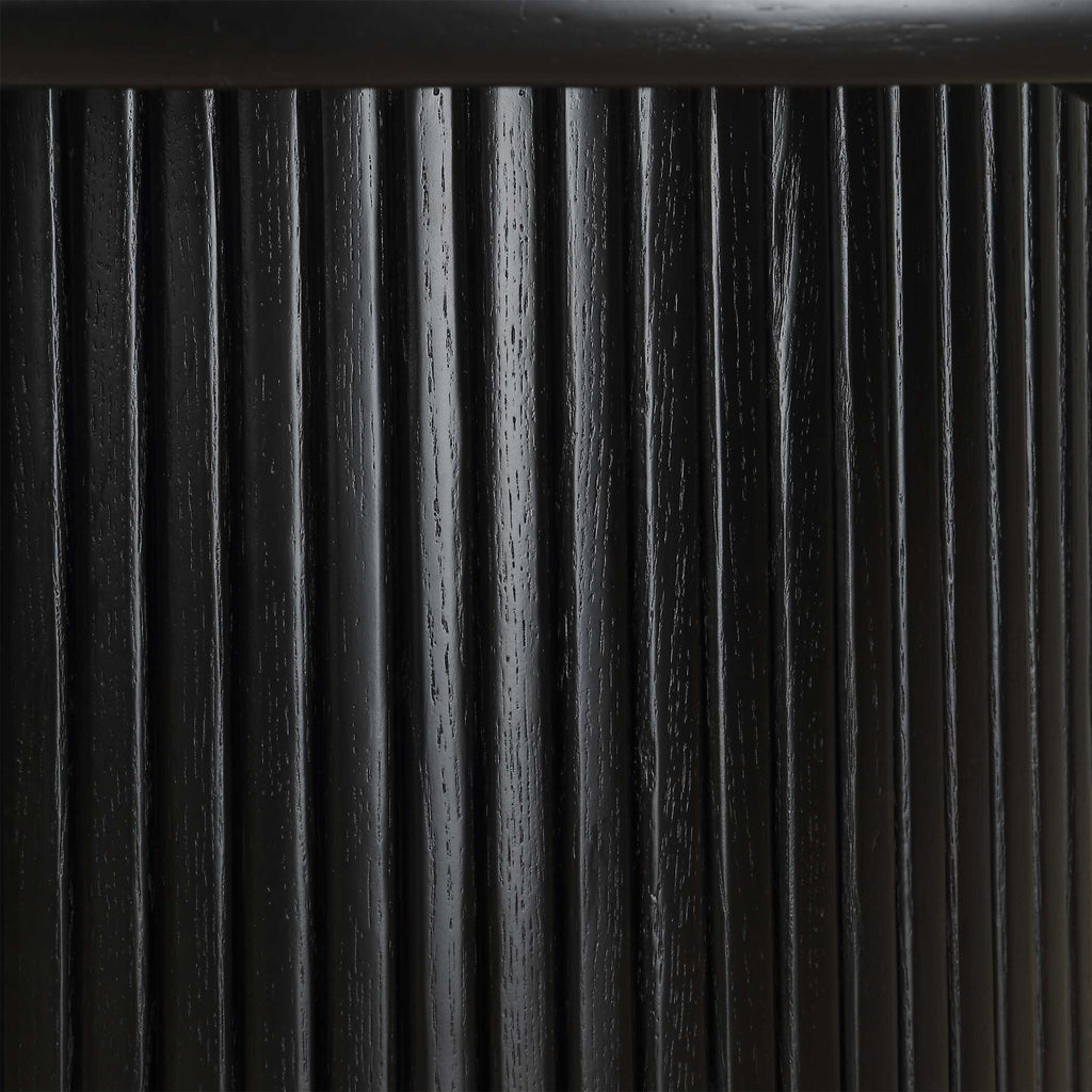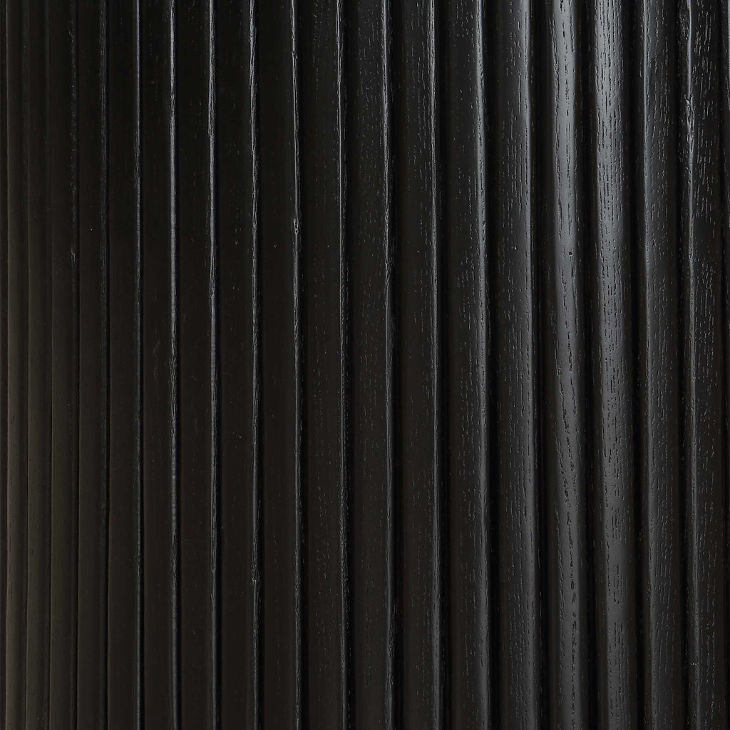 This Round Dining Table Is Crafted From Primarily Solid Oak Wood And Finished In A Rich Black Hue, Offering A Perfect Blend Of Contemporary Style And Natural Durability. The Thick, Fluted Base Leg Adds A Bold, Architectural Touch, Enhancing The Table's Elegant Design.