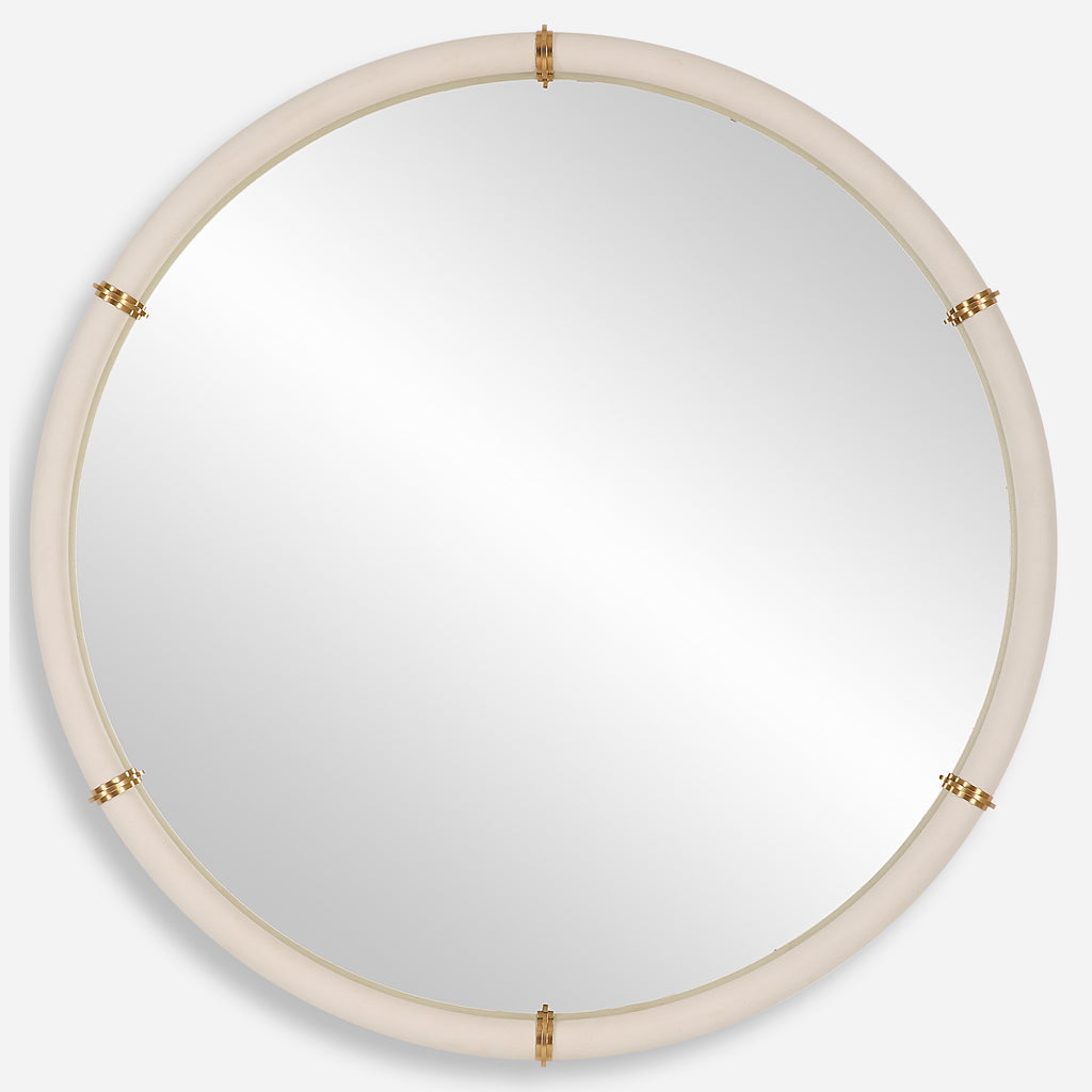The Cyprus Round Mirror Showcases A White Faux Shagreen Leather Wrap Featuring Brass Plated Steel Bands That Help Elevate This Sophisticated Design.