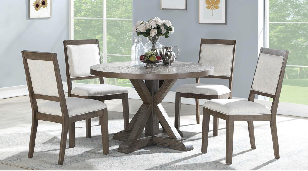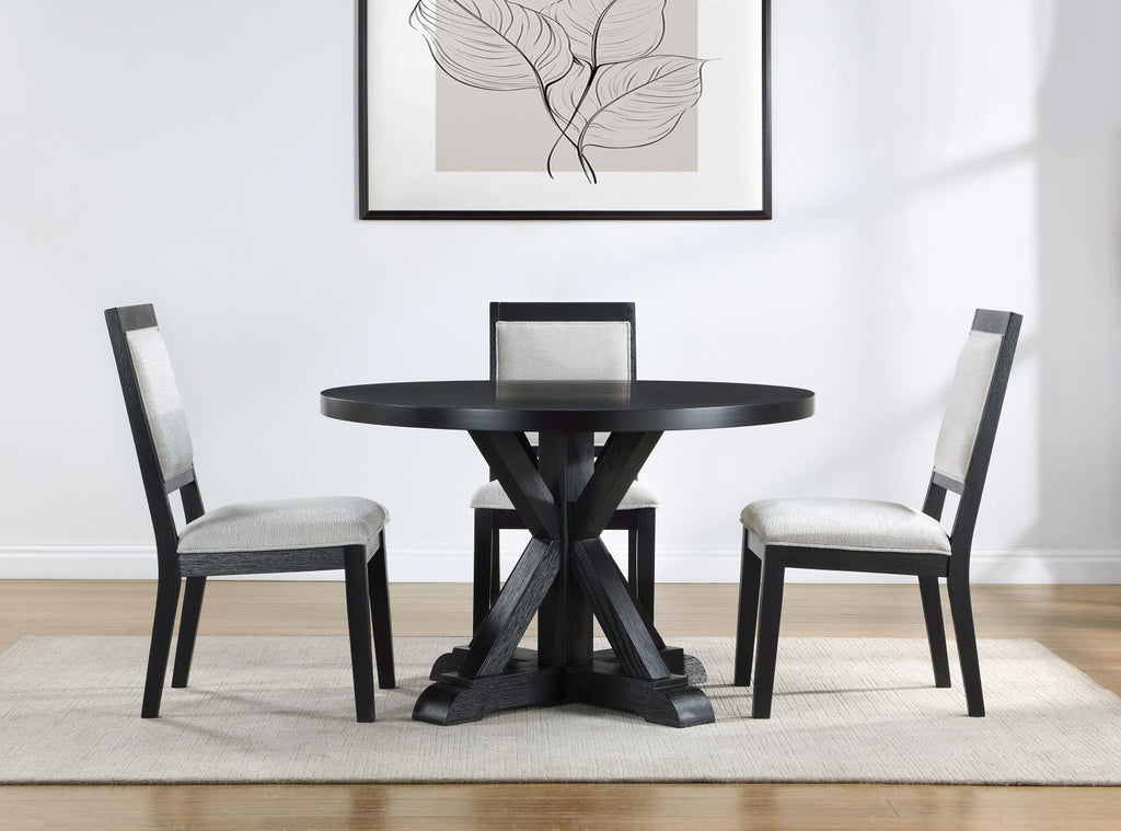 The Molly 5PC dining set features a 48 inch round dining table and comfortable side chairs. This contemporary lodge styling features an architectural designed timber base dining table with a complimenting thick table top. This cozy dining set makes conversation easy and will make a grand statement in your home.