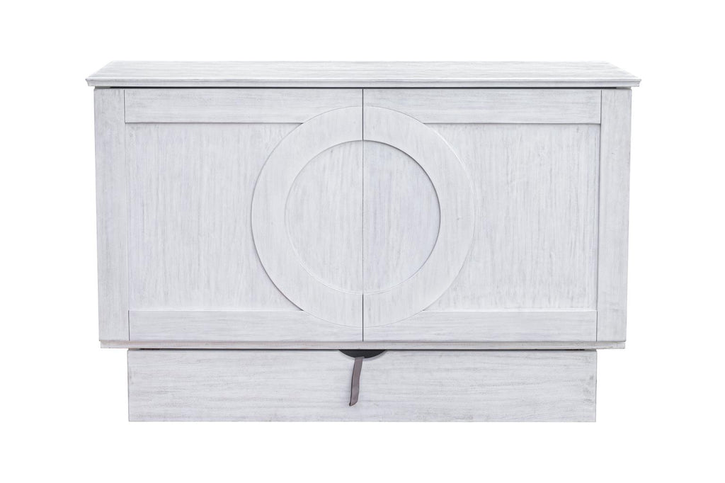 The McKenzie Sleep Cabinet brings versatility to any room in your home! Quality-built for function and style, this sleep cabinet enhances your bedroom or guest room with its distressed white finish. The cabinet front has recessed panels and a raised circular motif adding to its unique design. A queen-size bed easily pulls out with a telescoping mechanism and the cut-out handle on its recessed base.