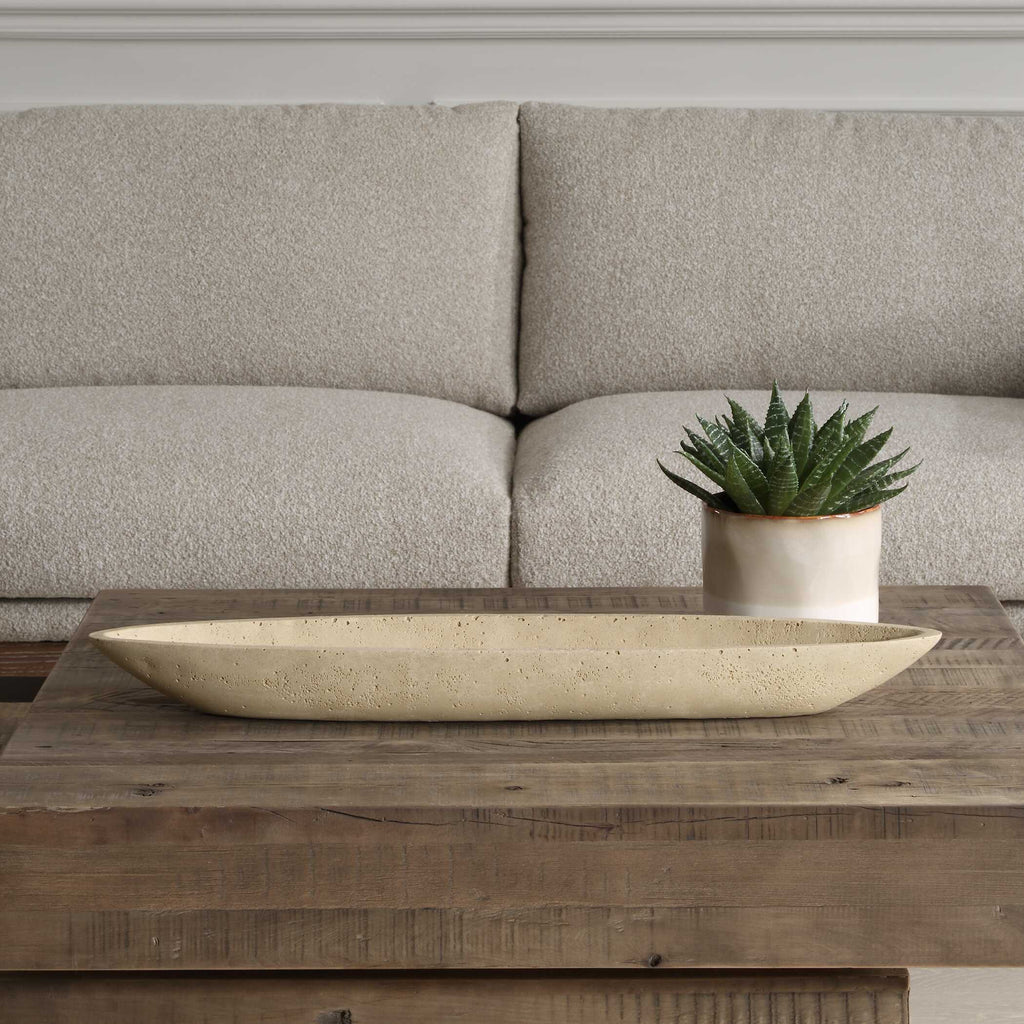 Embrace The Perfect Fusion Of Aesthetics And Utility With This Canoe-shaped Bowl, Crafted From A Unique Cast Ivory Man-made Stone That Replicates The Look Of Travertine.