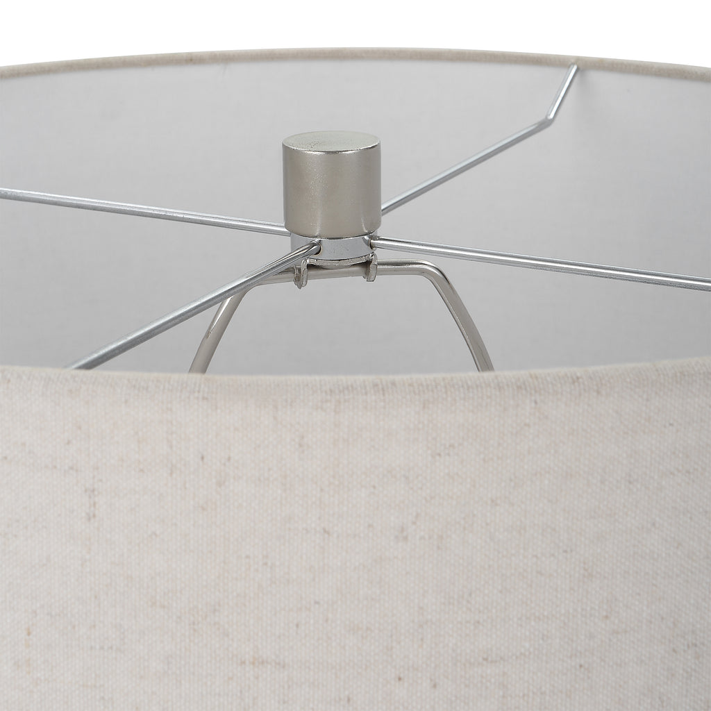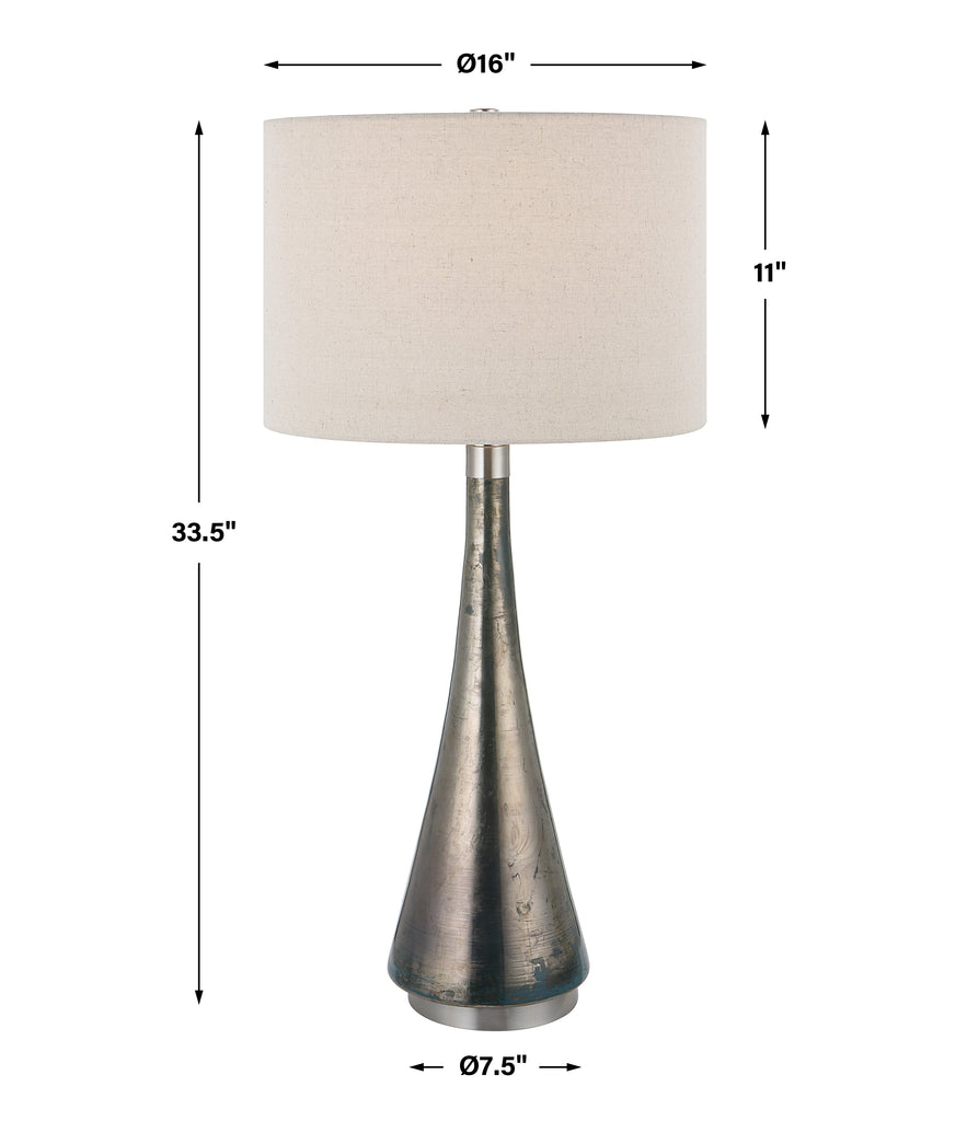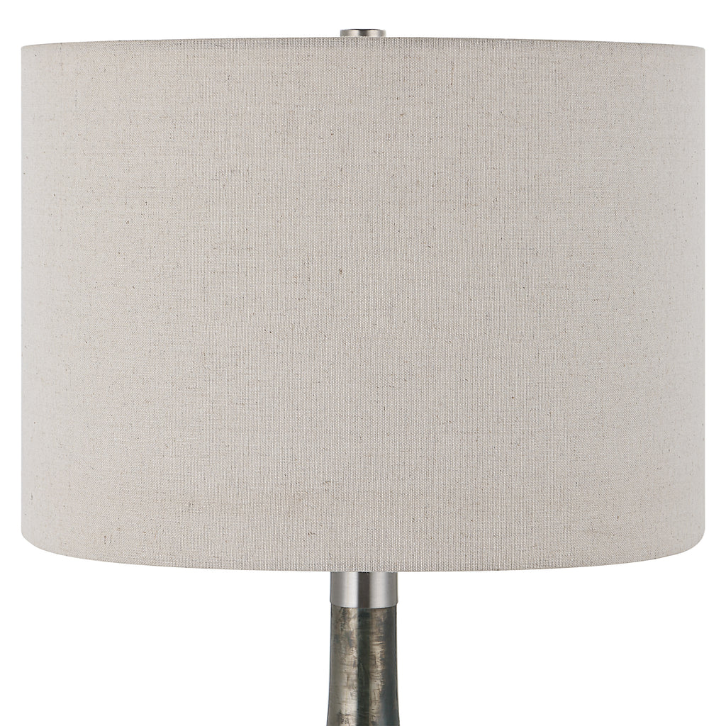 This Table Lamp Features A Graceful Tapered Base Crafted From Artisanal Blue-green Metallic Glass. Iron Accents Are Finished In Brushed Nickel. The Drum Shade Is Covered In A Light Oatmeal Fabric With Natural Slubbing.