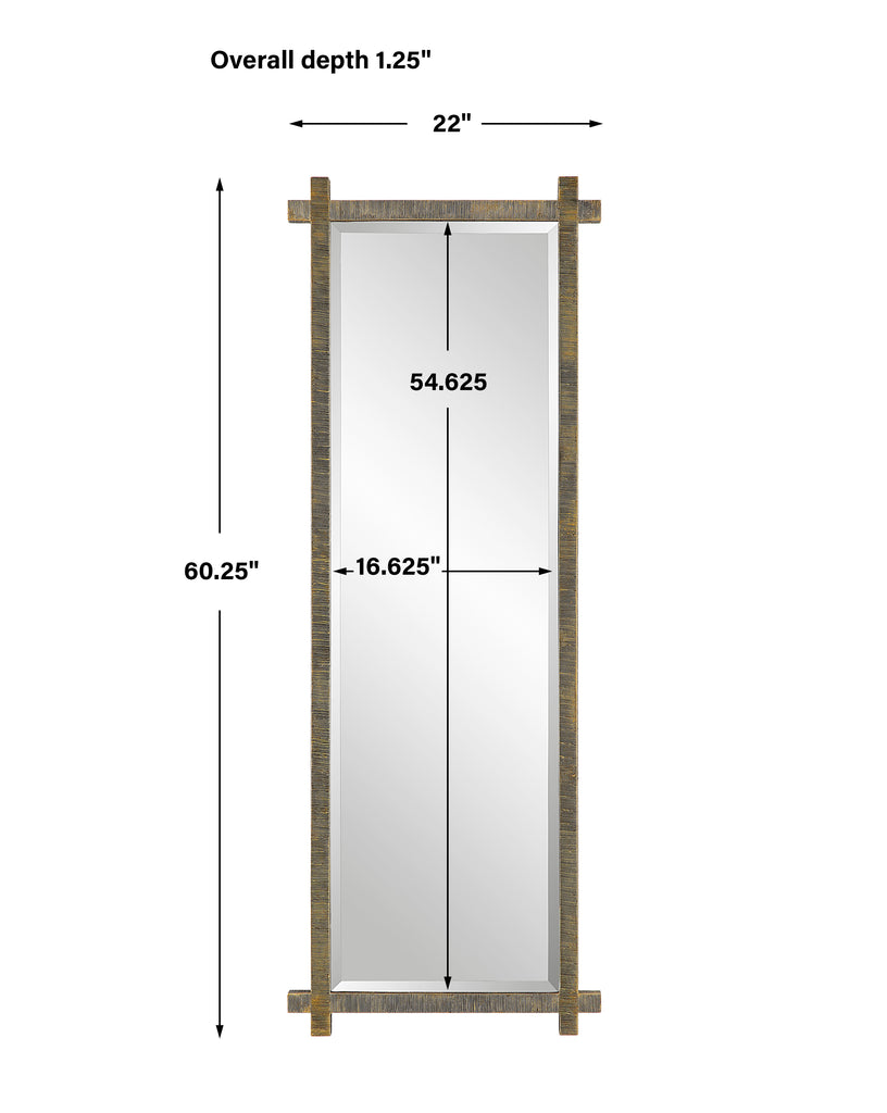 This Dressing Mirror Features A Heavily Antique Gold Finished Frame With Ribbed Texture, Adding A Tribal Feel. The Piece Has A Generous 1 1/4" Bevel And May Be Hung Horizontal Or Vertical.