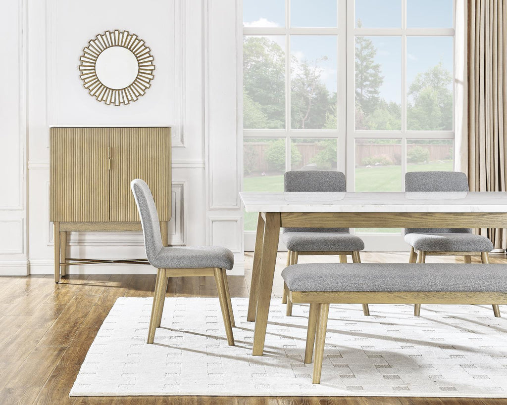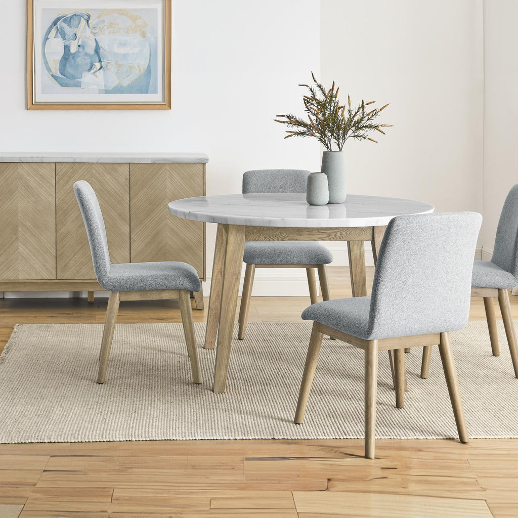 The epitome of sophisticated simplicity, the Vida 48" Round White Marble Table seamlessly merges mid-century modern flair with Scandinavian design. At a full 48" diameter, the table comfortably accommodates four, fostering intimate conversations and memorable gatherings. Adorned with canted solid wood legs in a burnished blonde finish, it exudes an airy elegance that elevates any room. Embrace the allure of round-table intimacy and timeless style with the Vida Marble Table.