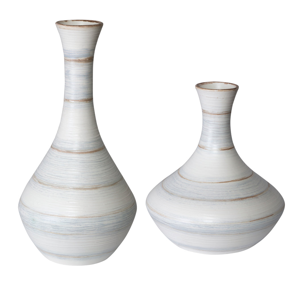Handcrafted From Ceramic, These Fluted Vases Are Finished In Striped Soft Ivory, Blue, And Tan Glaze. Sizes: S-11x21x11, L-12x14x10.