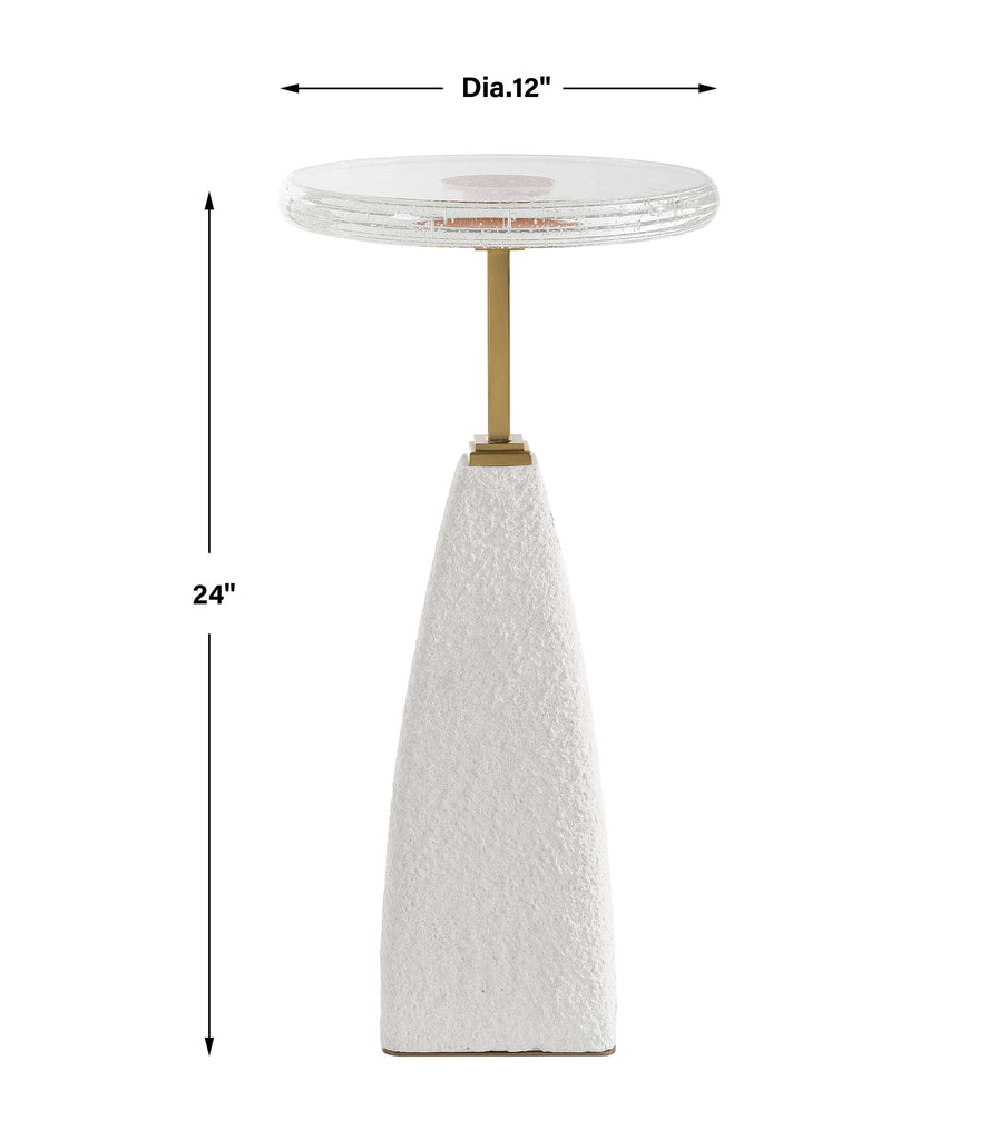 The Sora Drink Table Features A Thick Seeded Glass Top With A Complimenting White Sandstone Base And Brushed Brass Stainless Steel Accents.