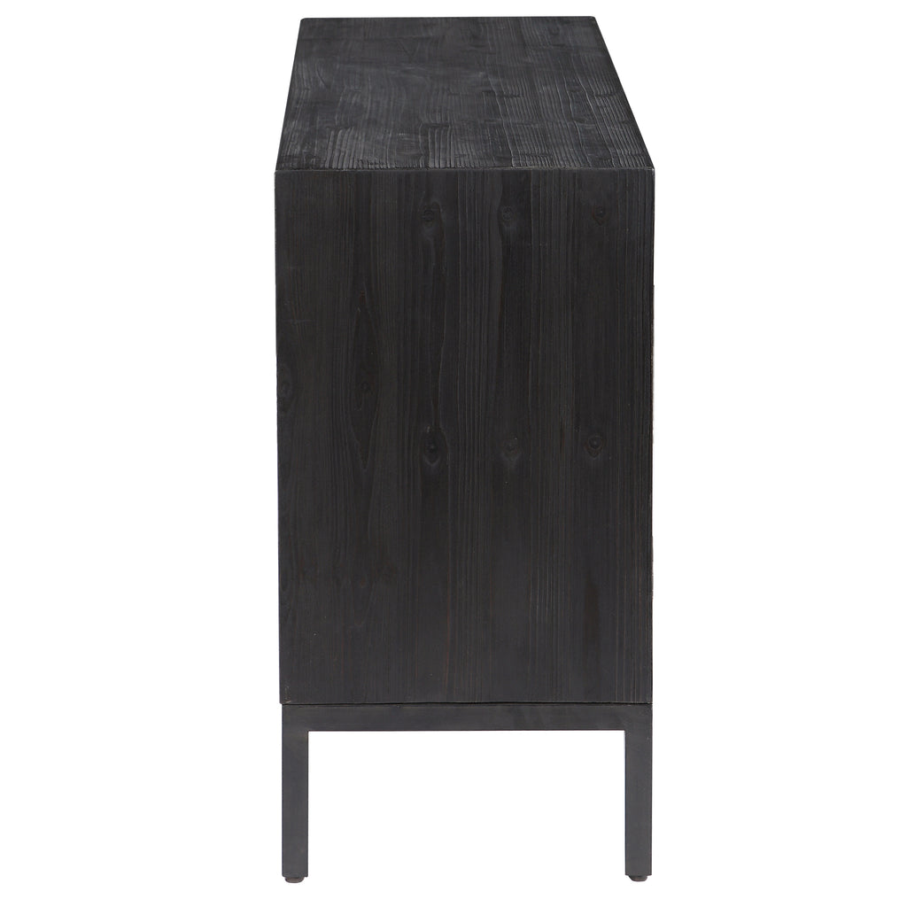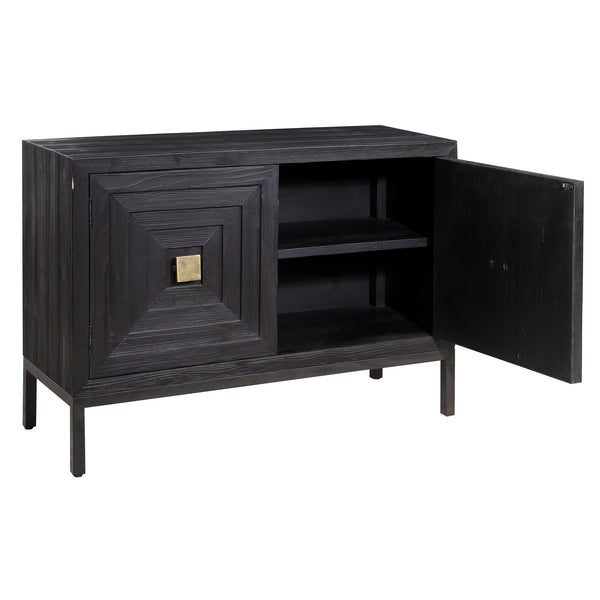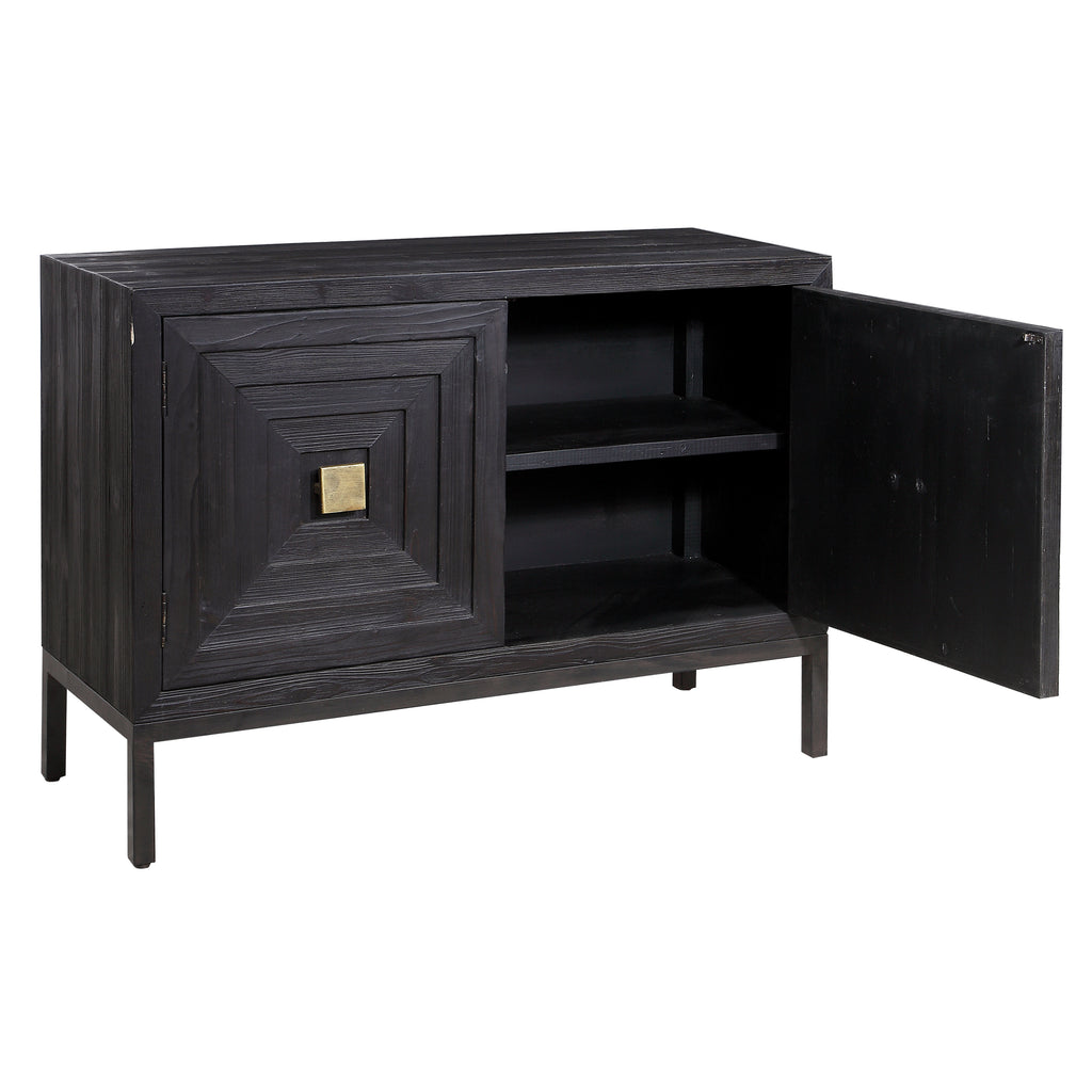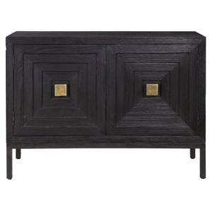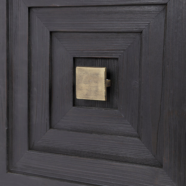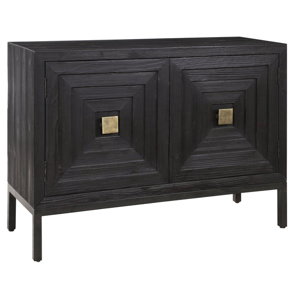 A Contemporary Geometric Two Door Accent Cabinet, Constructed From Deeply Grained Fir Wood Finished In A Dark Ebony Stain, Accented With Brushed Brass Hardware. Has One Fixed Interior Shelf.