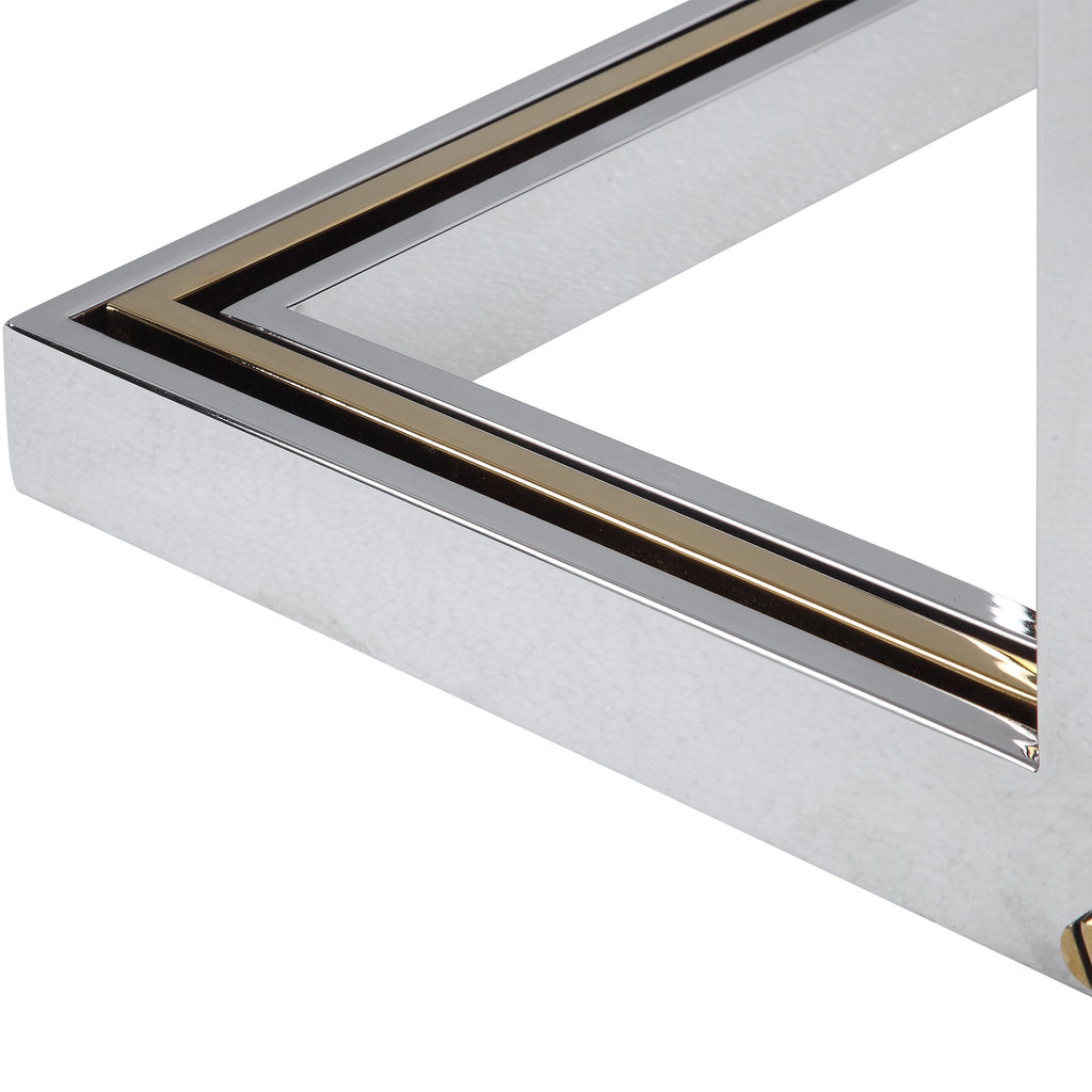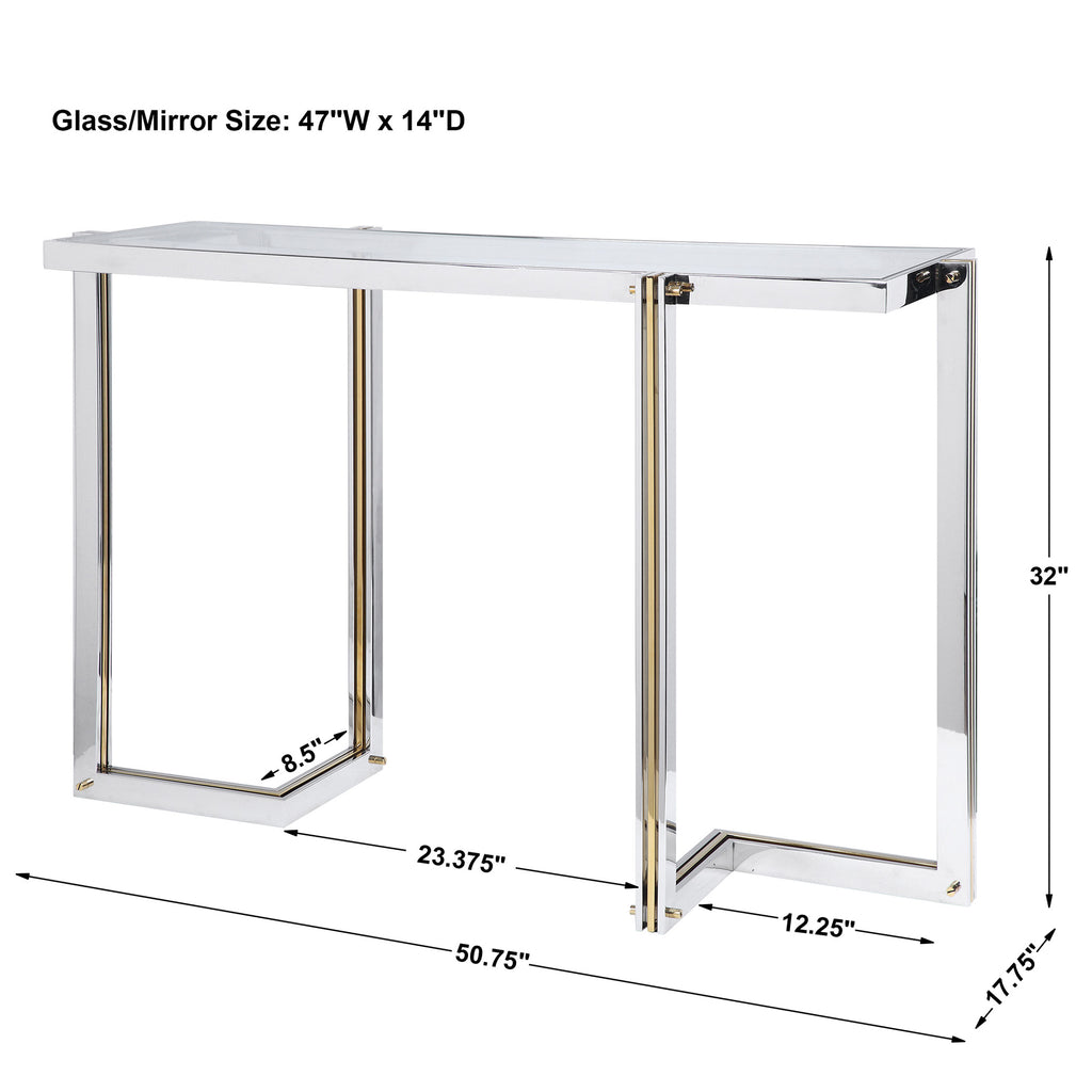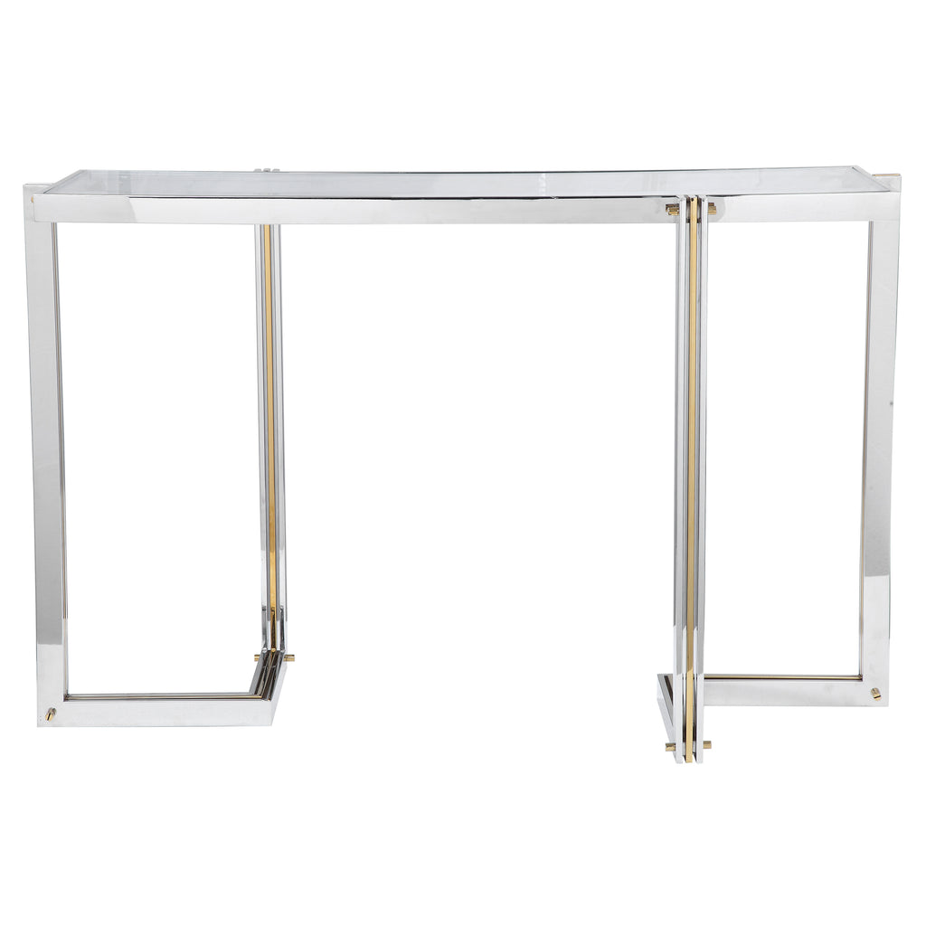 Modern Glam Console Features An Asymmetrical Dual-toned Stainless Steel Frame Finished In Polished Nickel And Polished Gold With A Clear Tempered Glass Top.