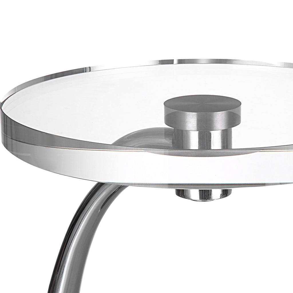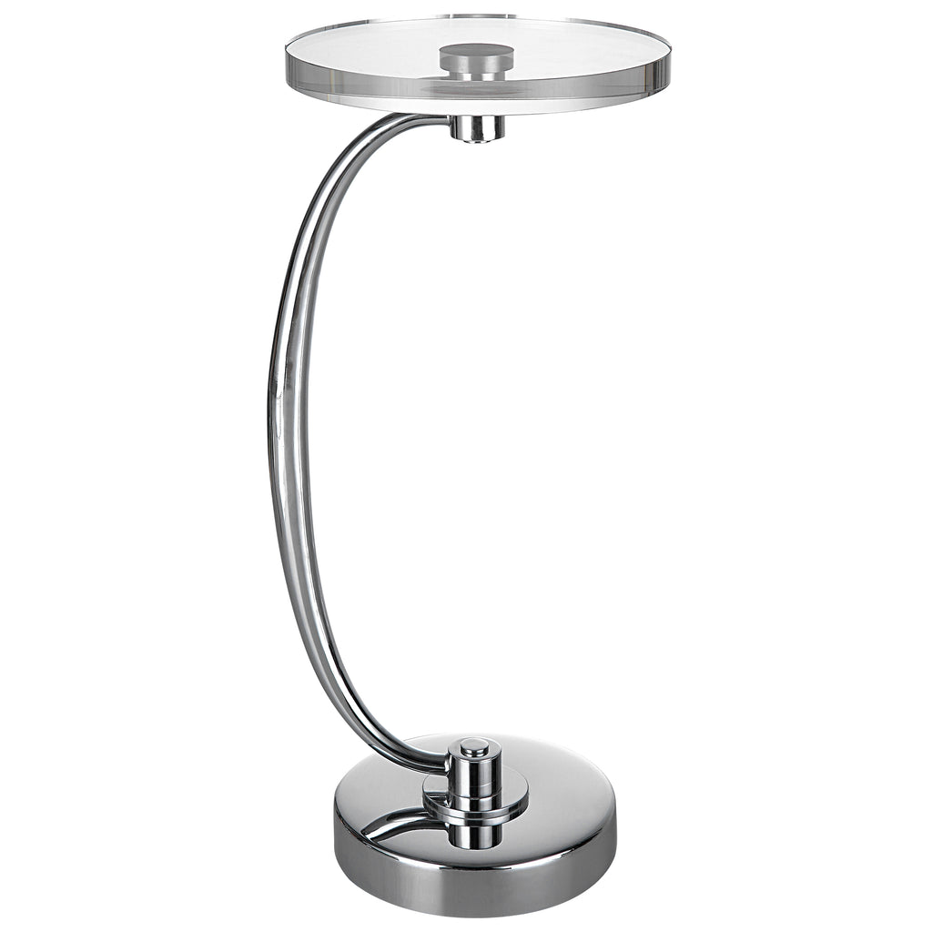 Minimal Yet Sophisticated, The Waveney Drink Table Displays A Sleek Curved Base In Polished Nickel Plated Iron With A Thick Crystal Top.