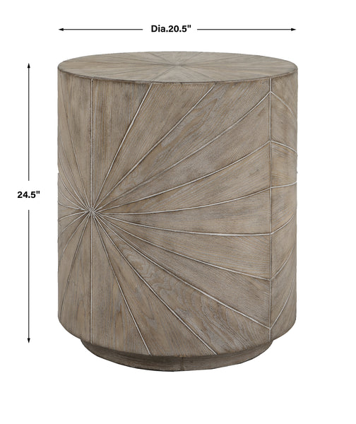 Crafted From Fir Wood Veneer, The Starshine Side Table Features A Starburst Motif Surround Finished In Warm Gray Stain With Light Cerusing That Accentuates The Natural Wood Grain.