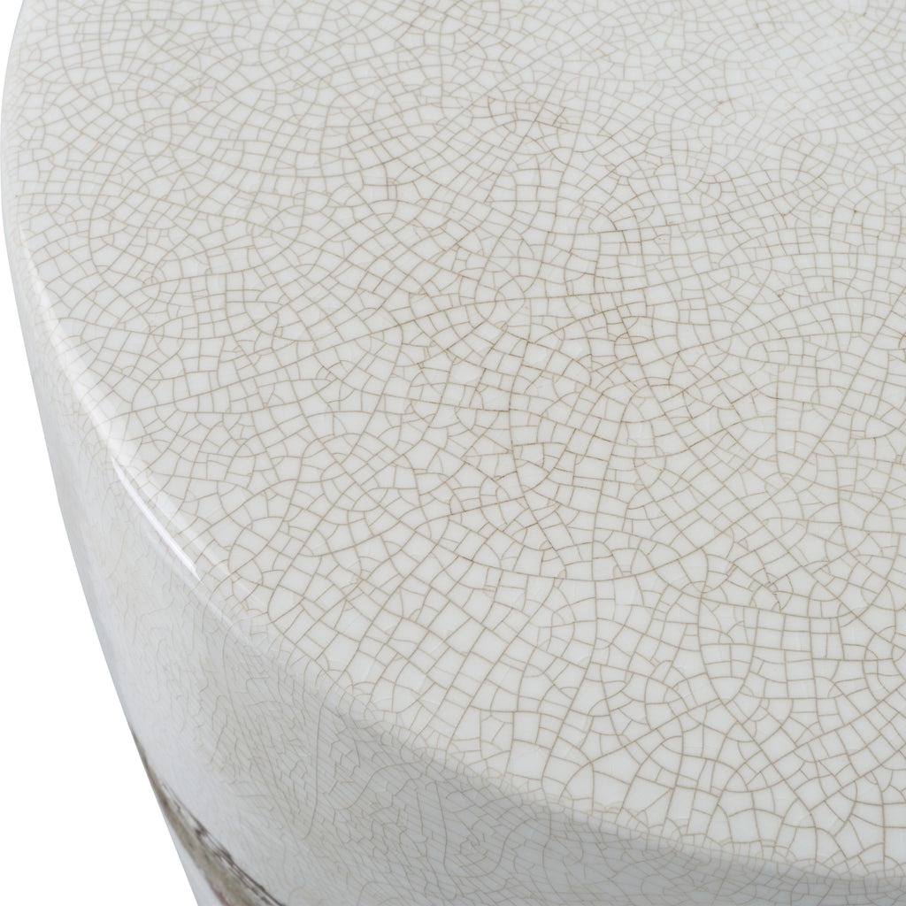 Showcasing A Rustic Casual Look, This Ceramic Garden Stool Features An Off-white Crackle Glaze With Distressed Rust Brown Details And Noticeable Ribbed Texture. May Be Used Outdoors, But Protection From Freezing Temperatures Is Recommended.