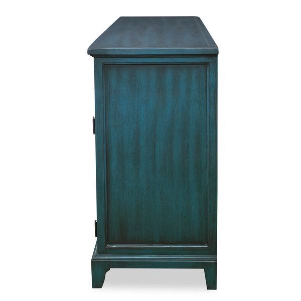 Featuring Solid Wood Construction, This Credenza Showcases Enhanced Cabinet Doors With Intricate Wooden Cutouts Over Glass. Finished In A Lagoon Green Exterior With A Contrasting Antique White Finished Interior And Accented With Coffee Bronze Finished Hardware. Open Shelf Styling Allows Versatility As A Sideboard Or Media Console. Interior Shelves Are Adjustable.