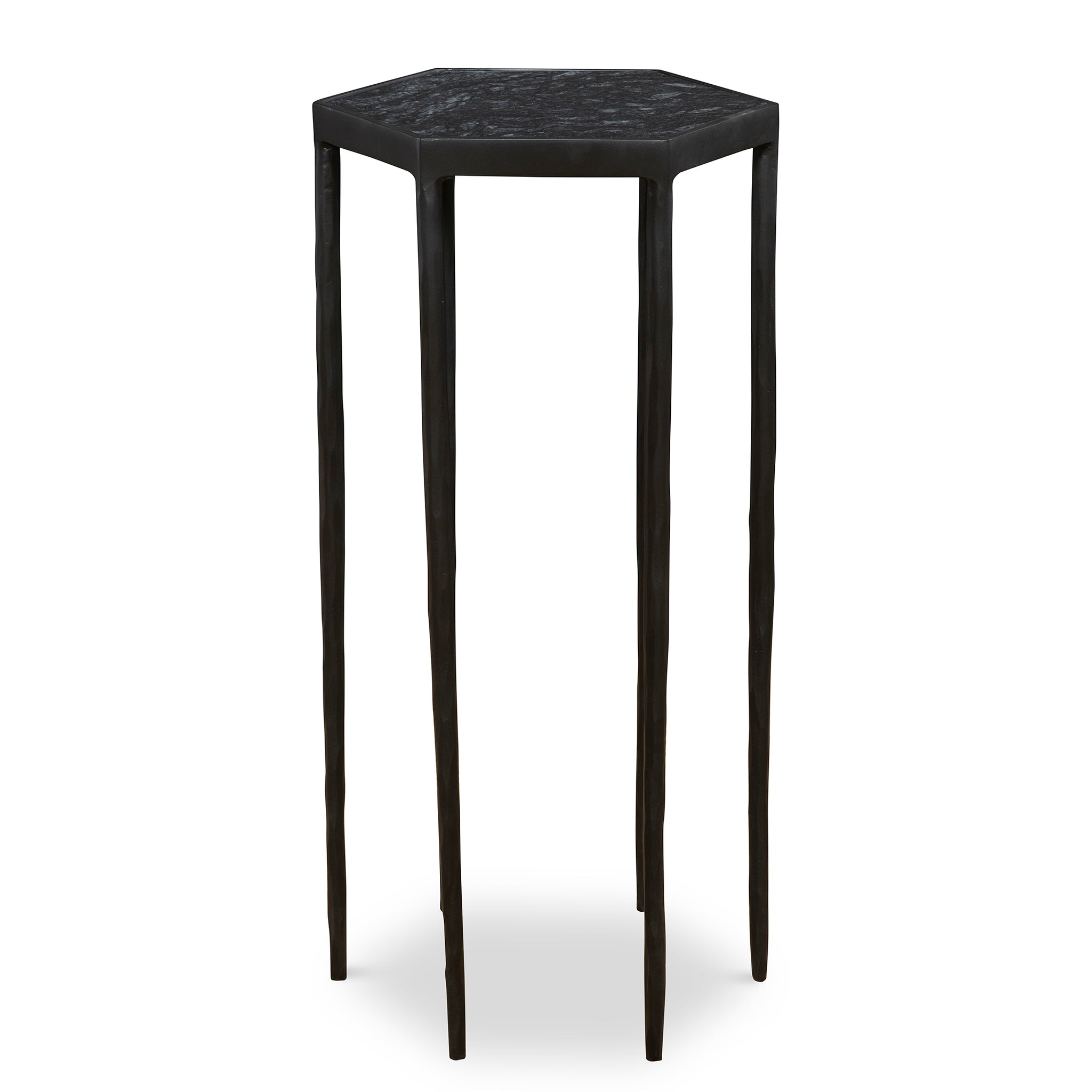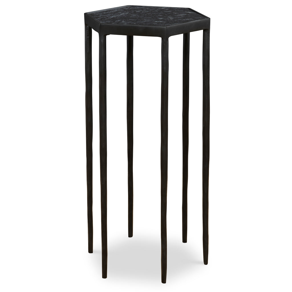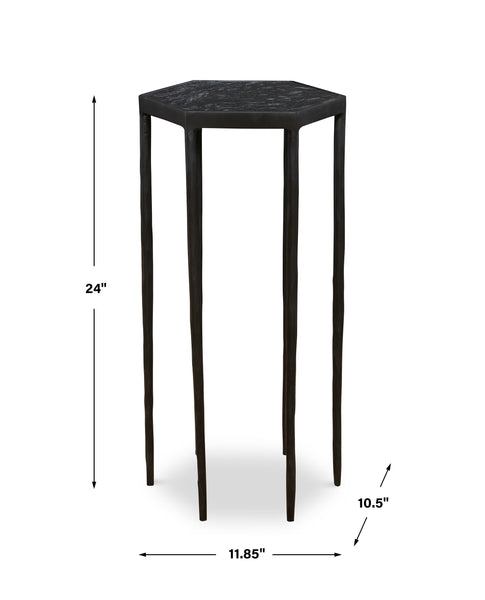 This Striking Hexagonal Table Features A Chiseled Iron Base Finished In Satin Black Paired With A Honed Black Marble Top With Natural White Veining. Because Of The Natural Characteristics Of Marble, Each Piece Will Have Unique Veining Patterns.