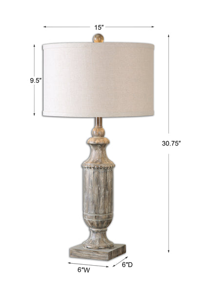 Aged Dark Pecan Stain With A Burnished Wash And Off-white Paint Drips. The Round Hardback Drum Shade Is An Oatmeal Linen Fabric With Natural Slubbing.