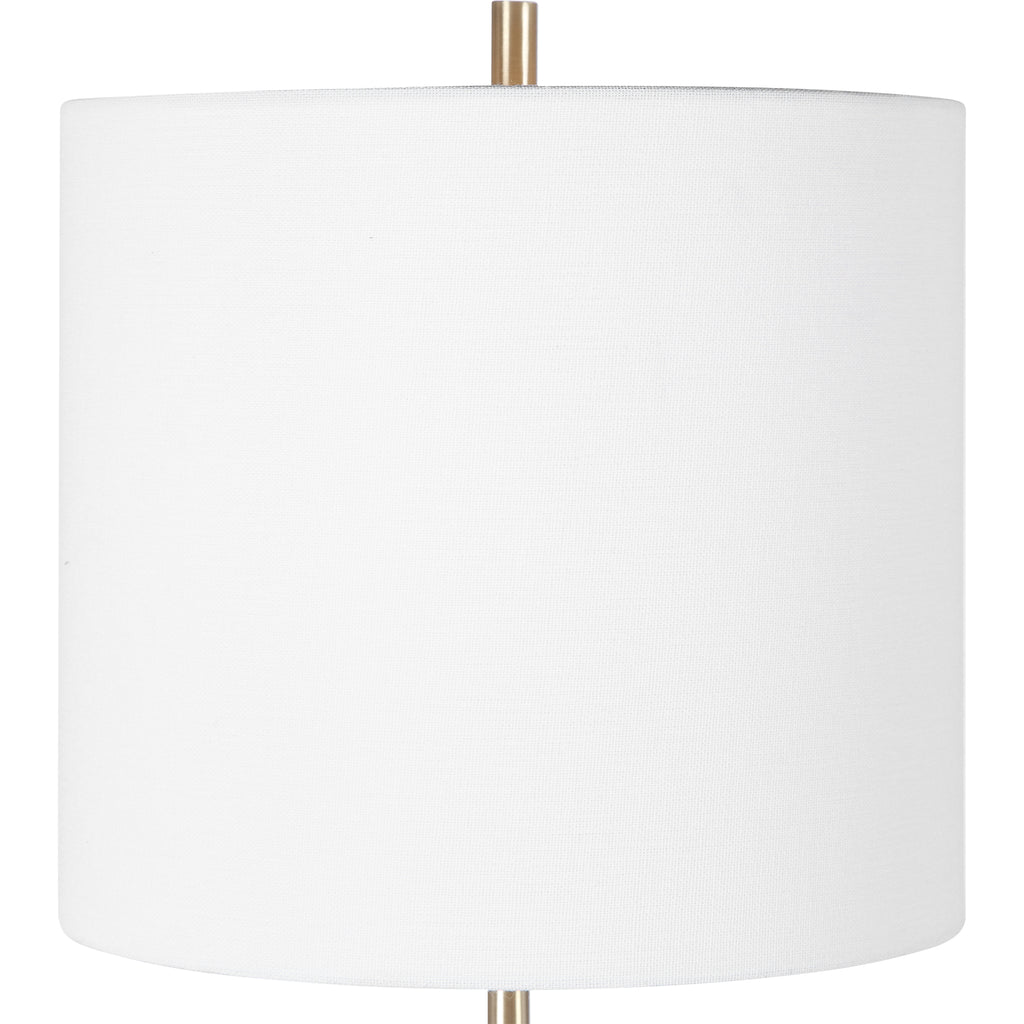 This Elegant Table Lamp Showcases A Thick White Marble Base With With Subtle Gray Veining, Accented With Brushed Light Brass Plated Details. The Lamp Is Paired With A White Linen Fabric, Round Drum Shade.