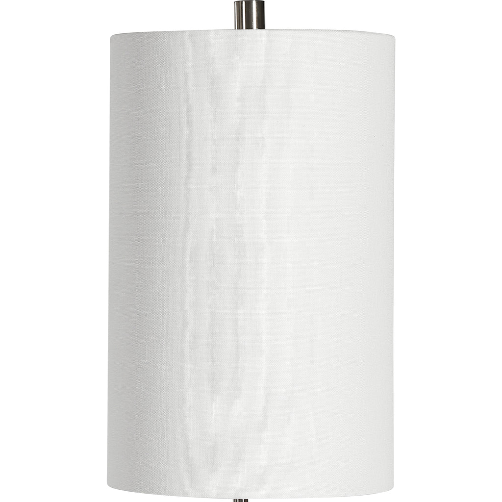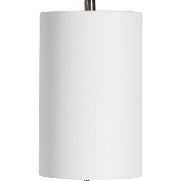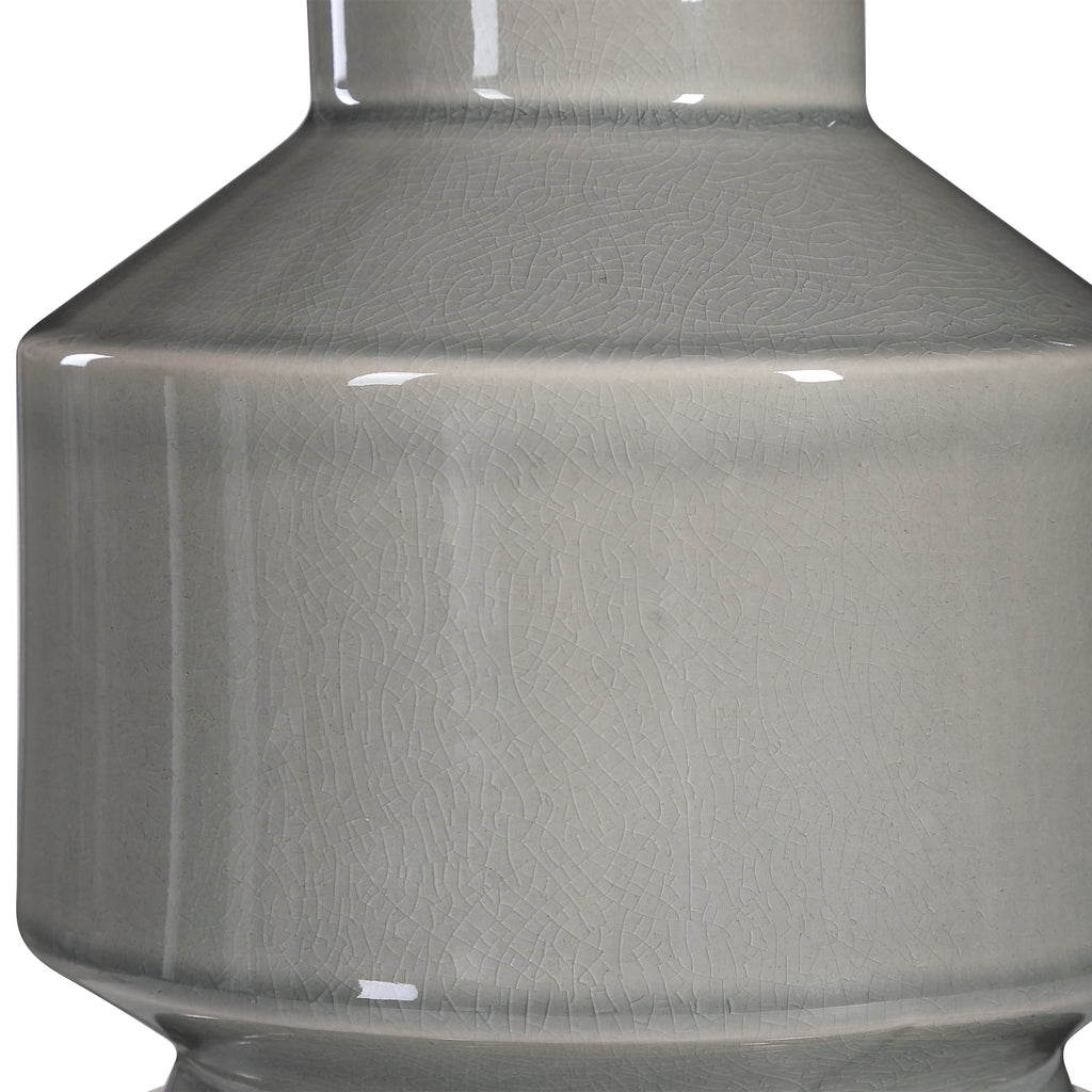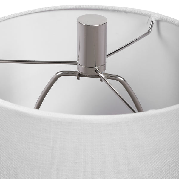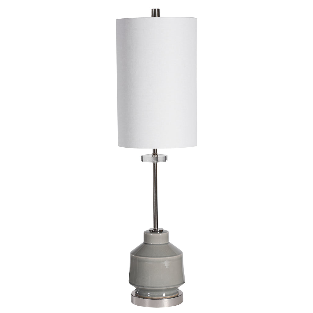 This Elegant Buffet Lamp Features A Clean Geometric Shaped Ceramic Base Finished In A Warm Gray Glaze, Accented By Polished Nickel Plated Iron Details And Crystal Accents. The Lamp Is Complemented By A White Linen Fabric Shade.