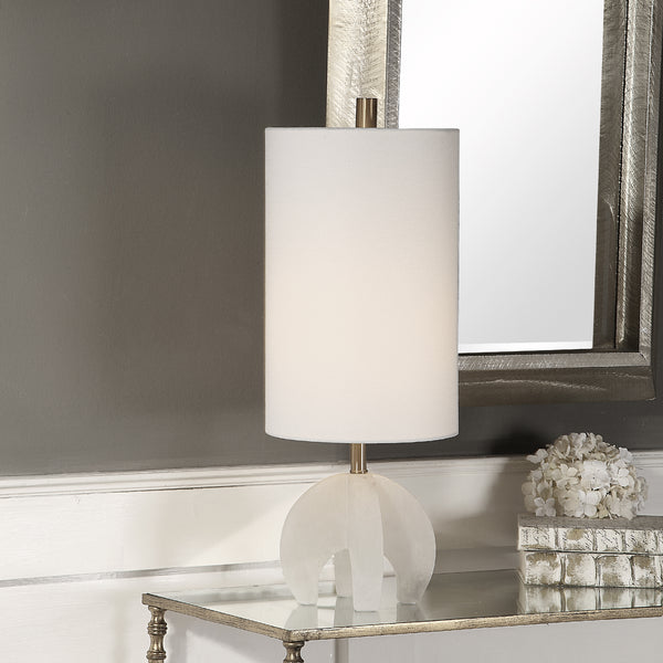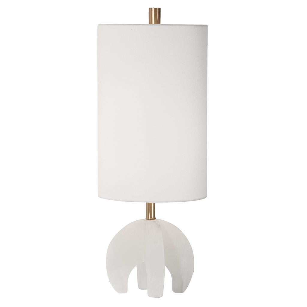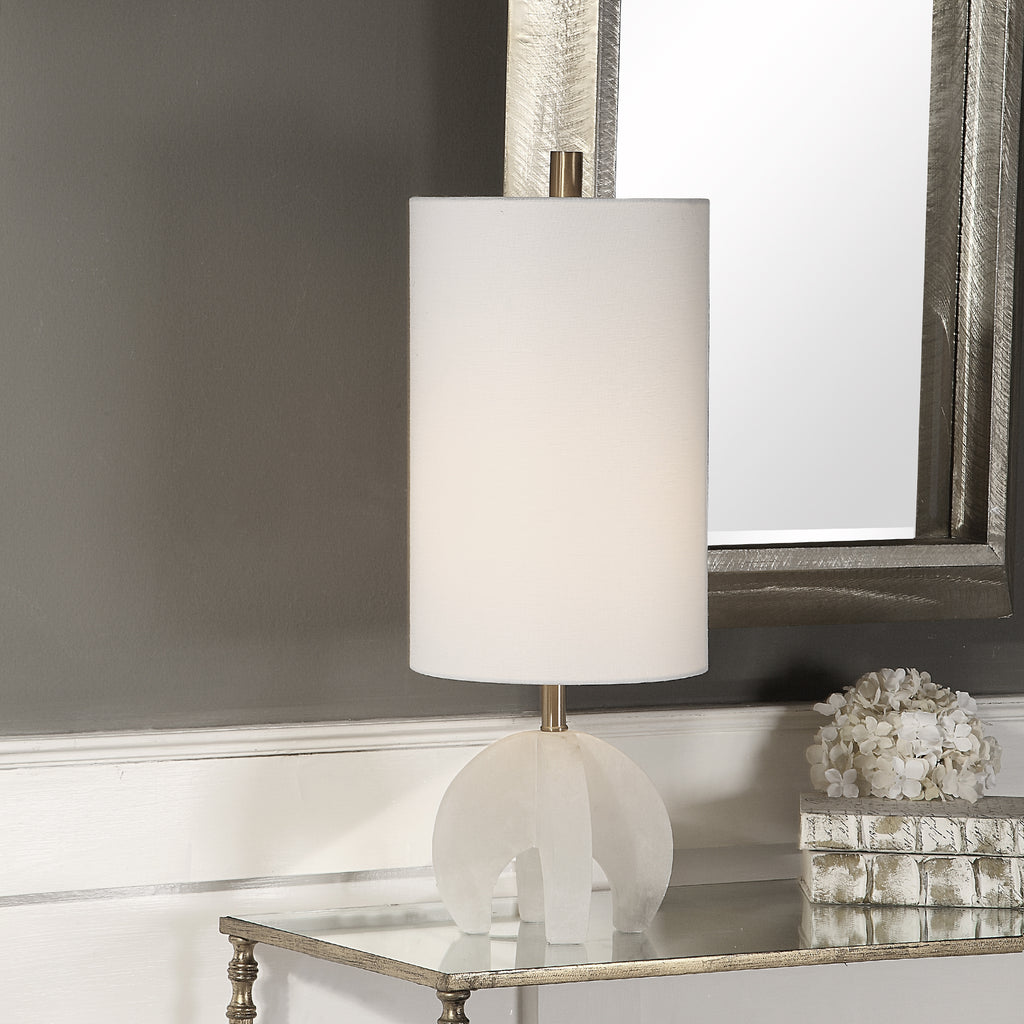 This Accent Lamp Keeps It Simple With A Uniquely Shaped, Polished Alabaster Base, Accented With Plated Brushed Brass Details, Creating A Conversation Piece For Any Home. The Tall, Round Hardback Drum Shade Is A White Linen Fabric.