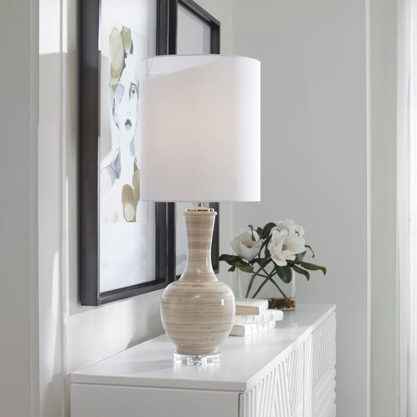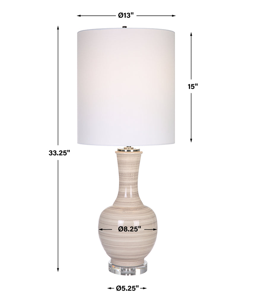 This Table Lamp Showcases A Traditional Curved Silhouette In A Striking Striped Motif. The Ceramic Base Displays Shades Of Taupe, Tan, And Charcoal And Is Accented By A Thick Crystal Foot With Polished Nickel Plated Details. The Round Hardback Shade Is Covered In A White Linen Fabric With Natural Slubbing.
