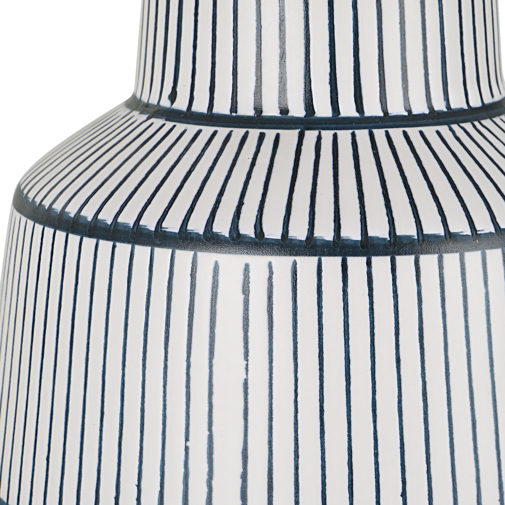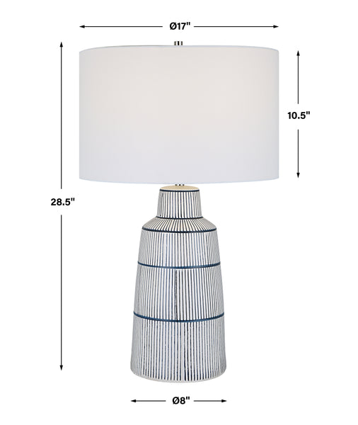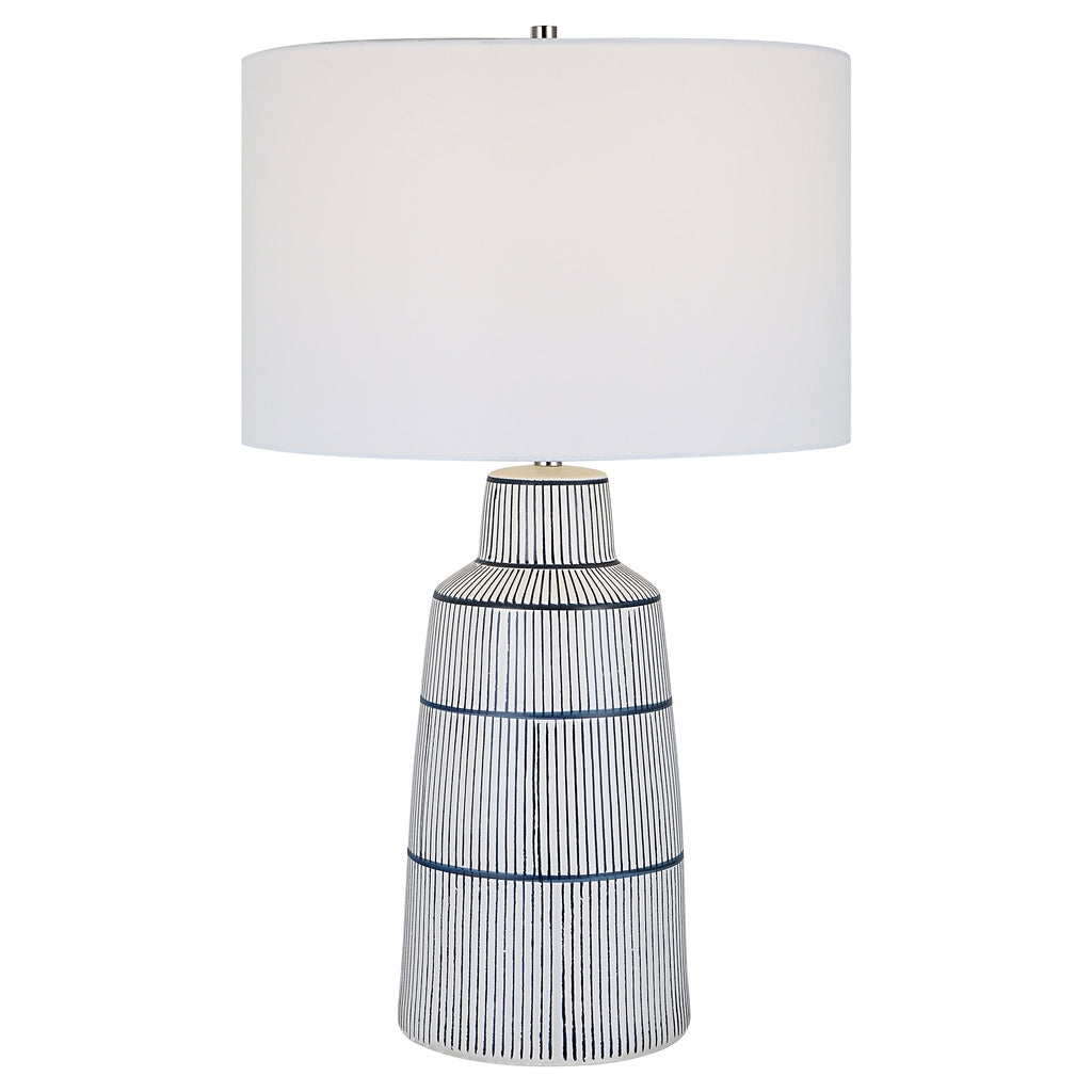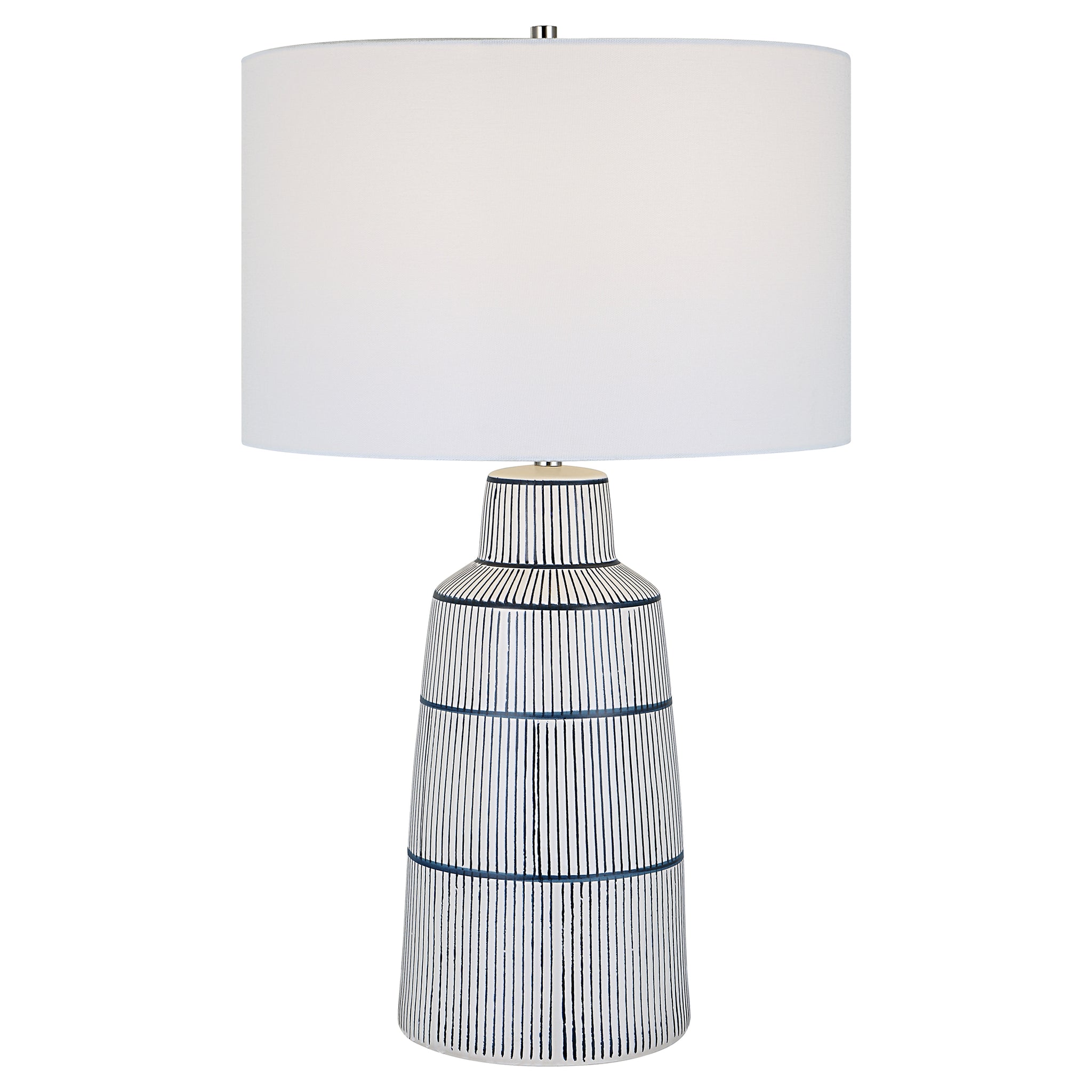 Inspired By The Classic Nautical Stripe Knit, This Ceramic Table Lamp Sports A Satin White Glaze With Rich Navy Blue Stripes And Polished Nickel Plated Accents. The Hardback Drum Shade Is Covered In A Crisp White Linen Fabric.