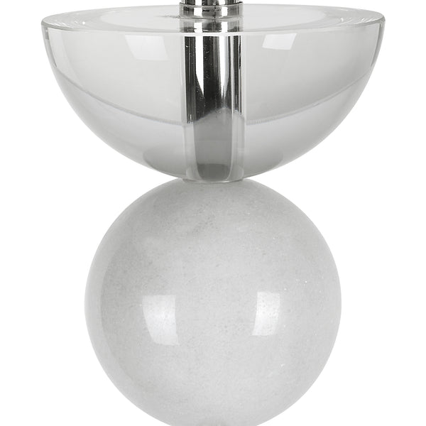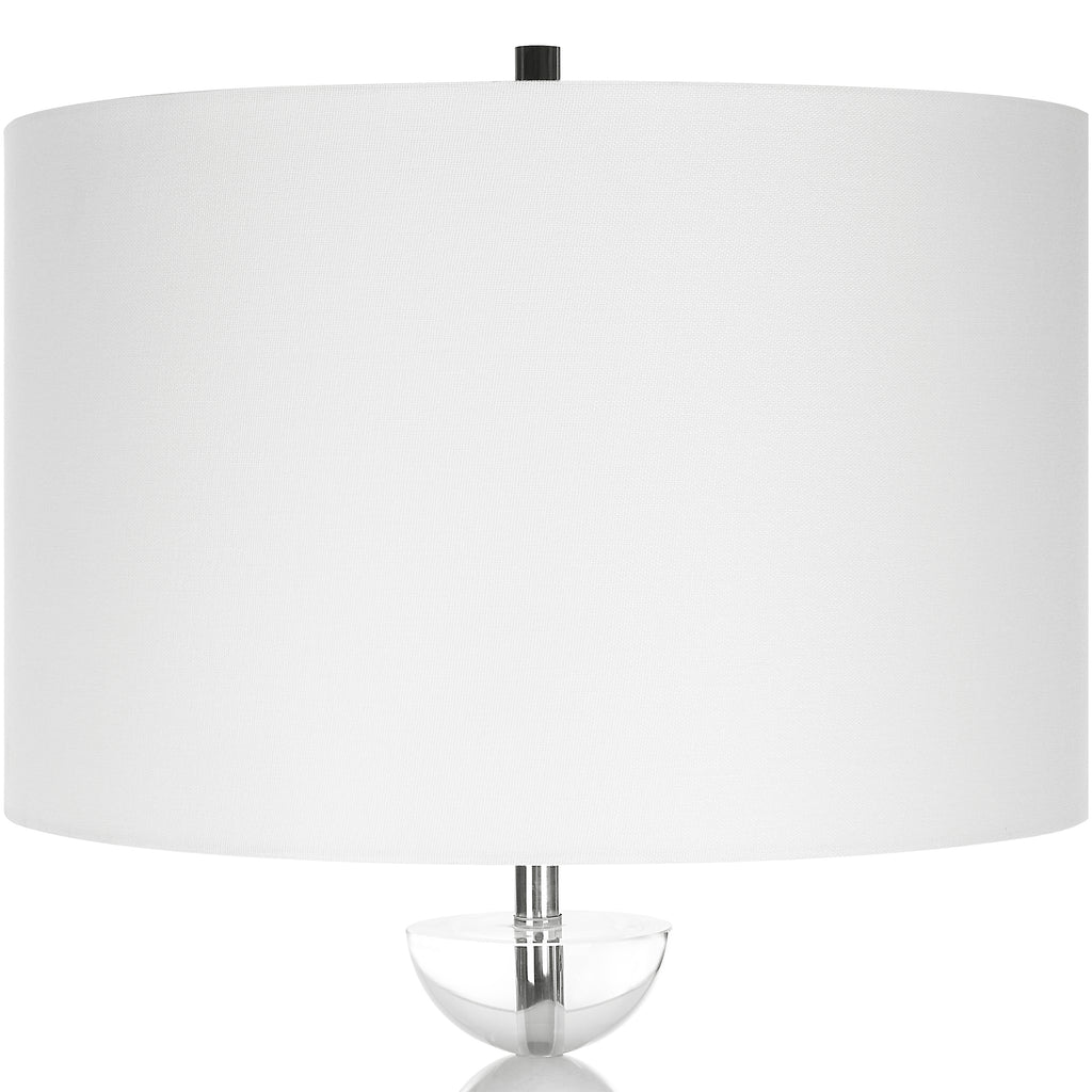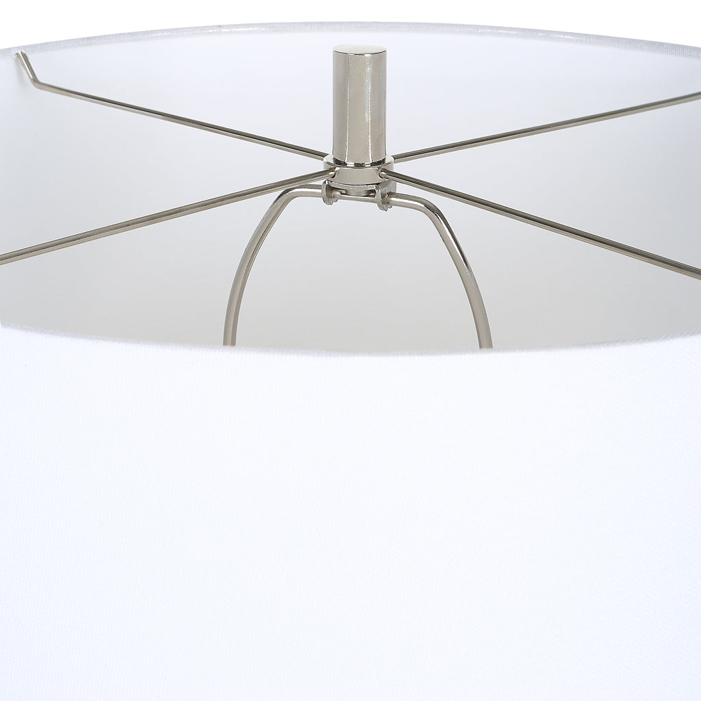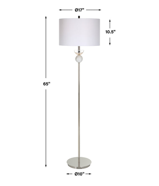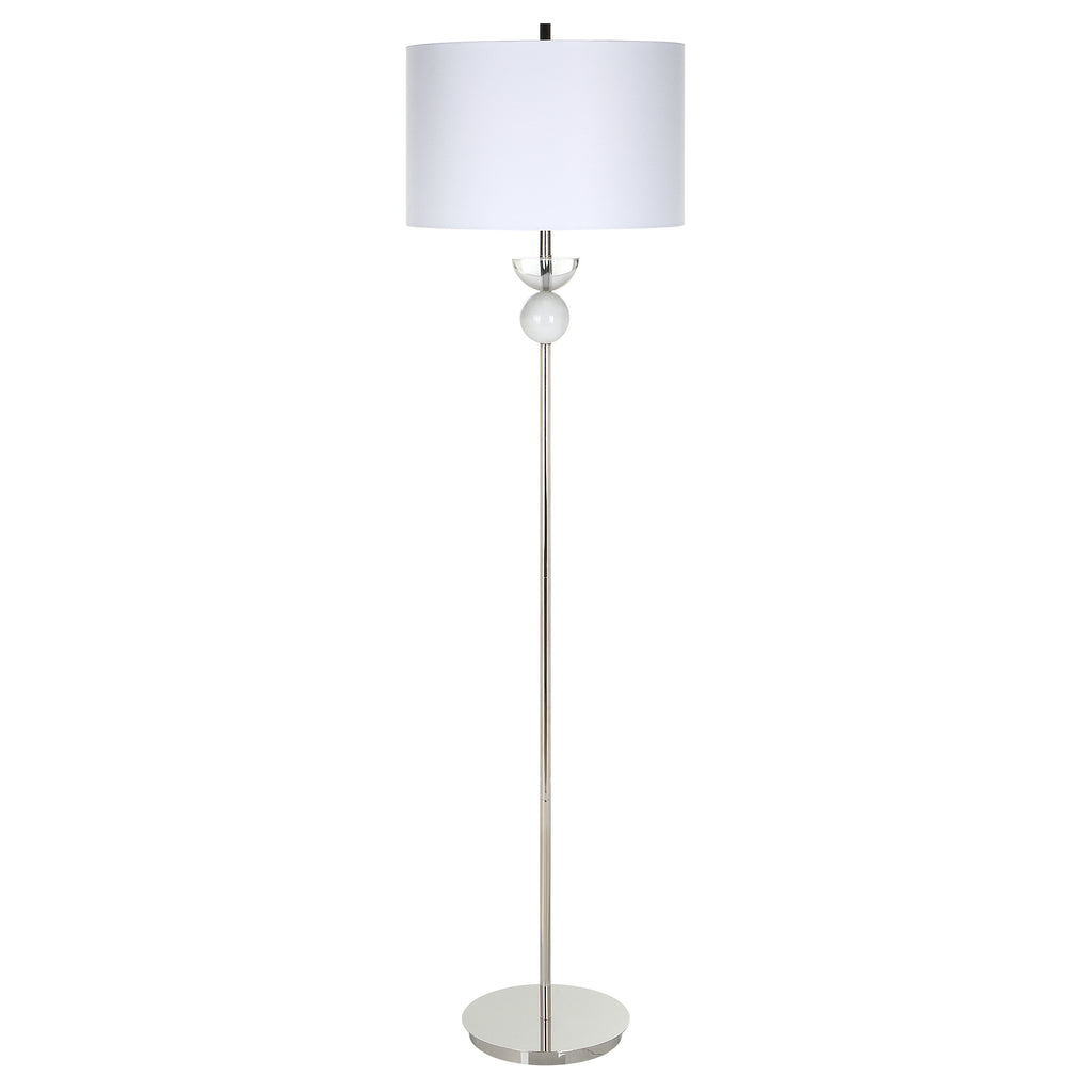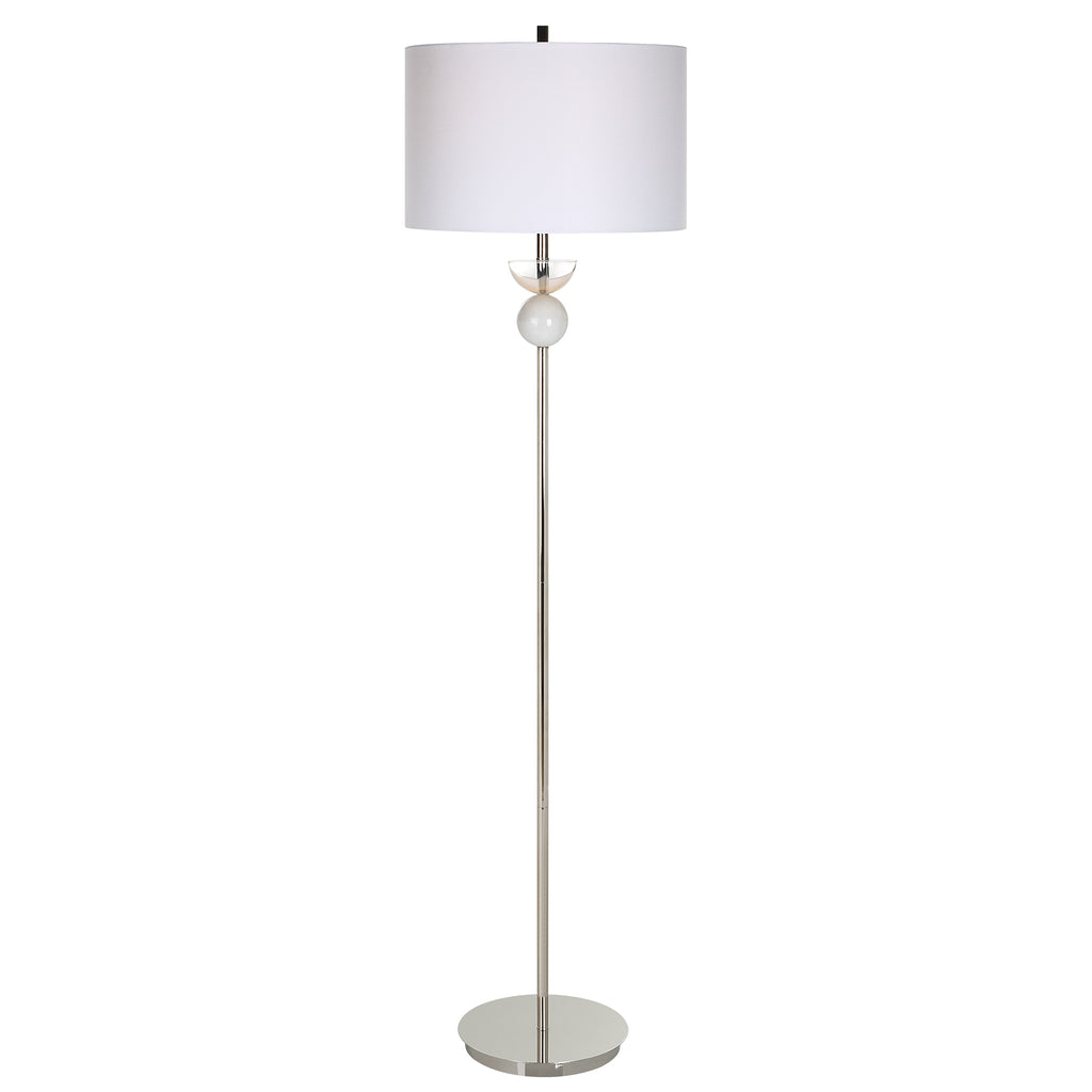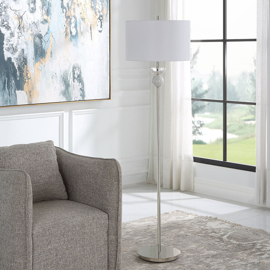 Sleek And Refined, This Contemporary Floor Lamp Showcases A Streamlined Iron Base In Polished Nickel With Natural White Marble And Crystal Accents. Paired With A Hardback White Linen Fabric Drum Shade.