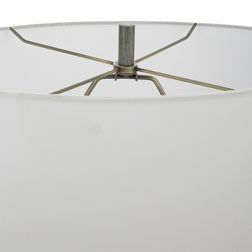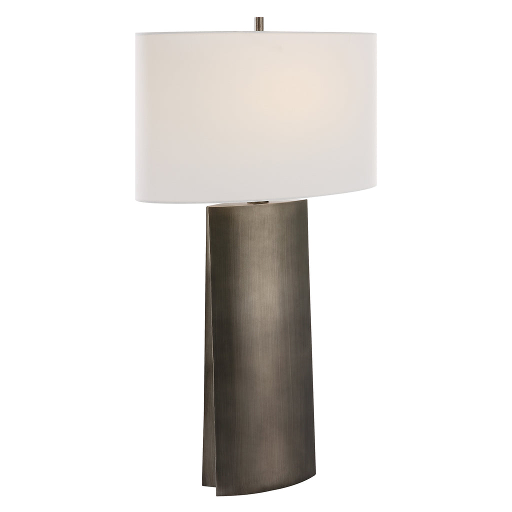 This Contemporary Sculptural Design Showcases A Tapered Silhouette With A Deep Channel Down The Sides, Finished In A Dark Steel Gray. The Oval Drum Shade Is Covered In A White Linen Fabric With Natural Slubbing.
