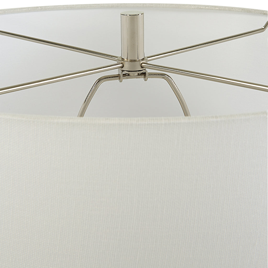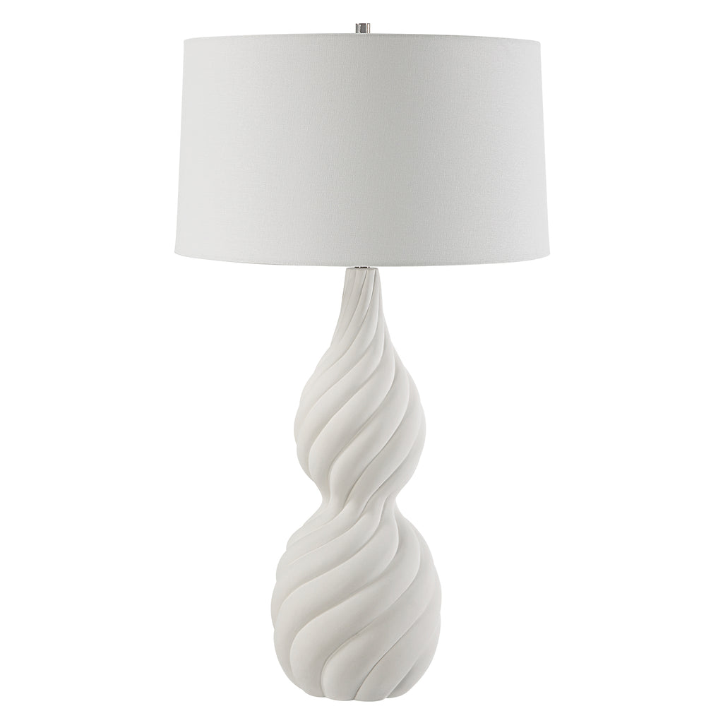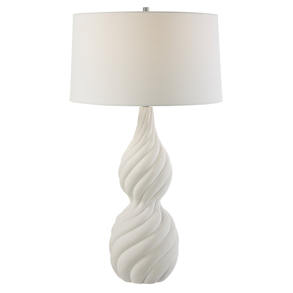 This Ceramic Table Lamp Features A 3-dimensional Twisted Swirl Pattern Finished In A Textured Chalk White Glaze Accented With Polished Nickel Details. The Tapered Round Shade Is Covered In A Crisp White Linen Fabric.