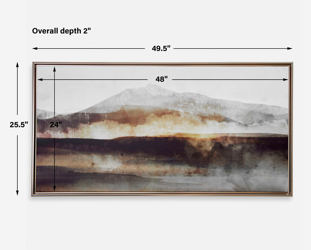 Splash Of Land Is Ideal For Nature Lovers And Art Enthusiasts Alike. The Framed Canvas Displays A Fusion Of Earth Tones While Portraying The Rugged Tranquility Of Mountainous Terrain. A Simple Gallery Frame With Bronze Gold Finish Completes The Artwork. Each Canvas Is Proudly Handcrafted And Printed In The USA. Artwork By Ken Roko.