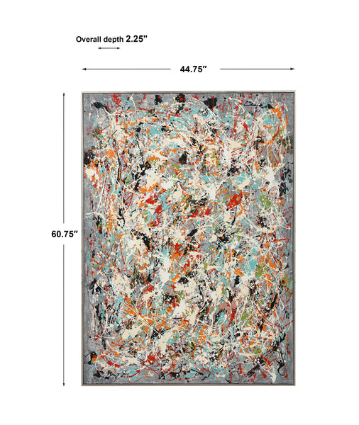 Inspired By Jackson Pollock's Famous Painting Style, This Graphic Hand Painted Artwork Serves As A Dramatic Focal Point For Your Space. The Smoke Gray Background Is Highlighted By Bright Orange, Aqua, Yellow, And Countless Other Vibrant Hues, Accented By A Sleek Silver Gallery Frame. Due To The Handcrafted Nature Of This Artwork, Each Piece May Have Subtle Differences. May Be Hung Horizontal Or Vertical.