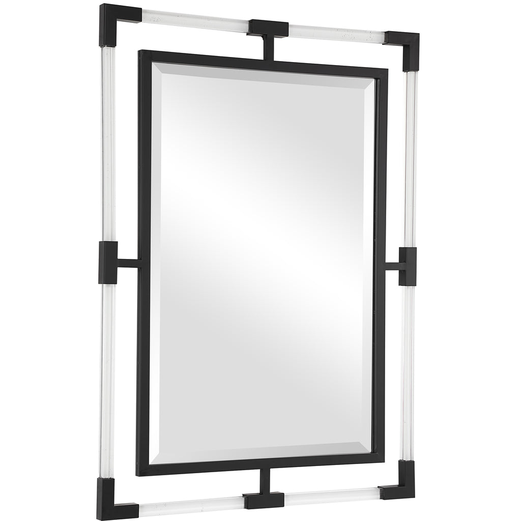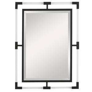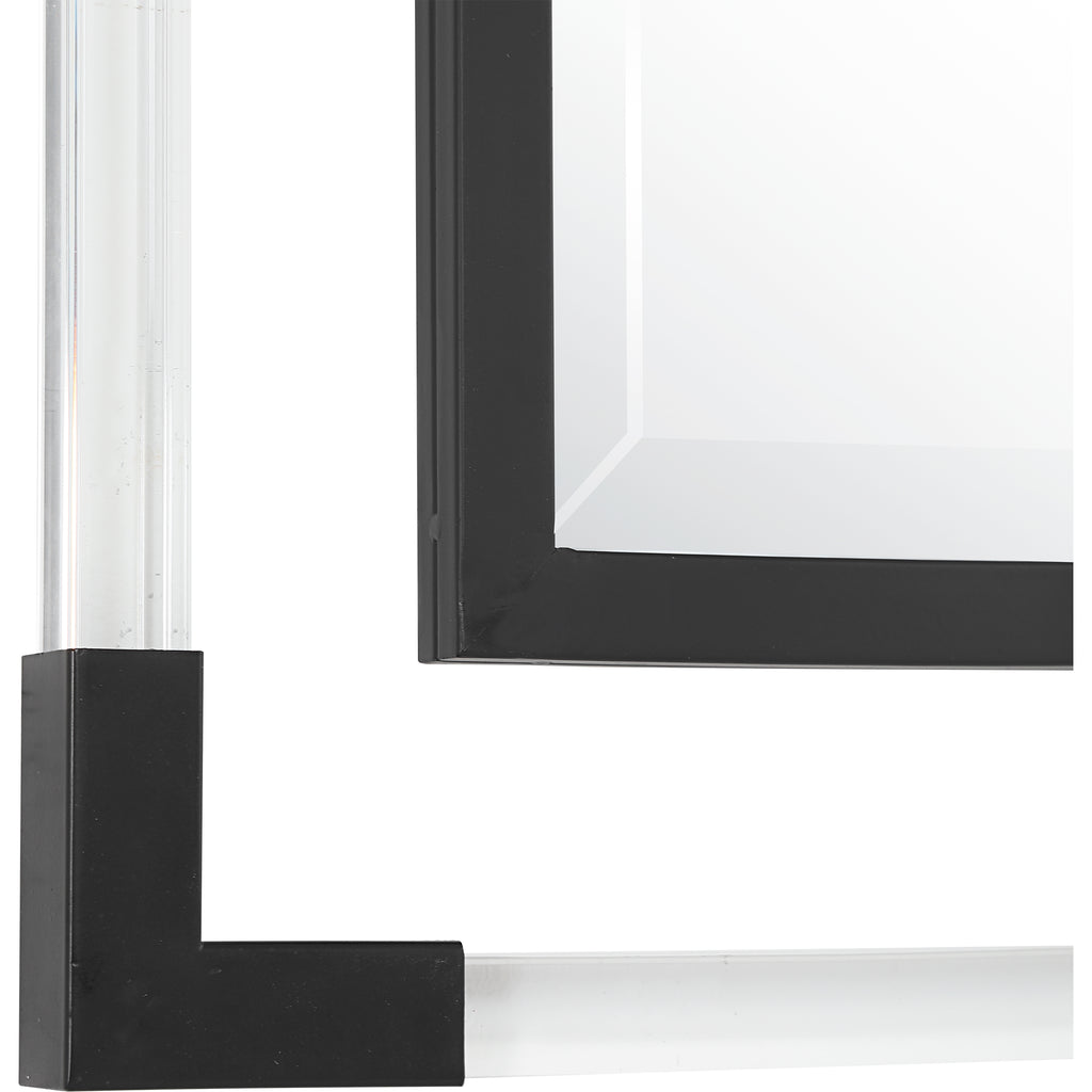 This Mirror Can Certainly Serve As A Focal Point For Any Room. Combining Forged Iron Finished In Matte Black, With Suspended, Clear Acrylic, Solid Bars Creating A Modern Feel. Mirror Has A Generous 1 1/4" Bevel And May Be Hung Horizontal Or Vertical.