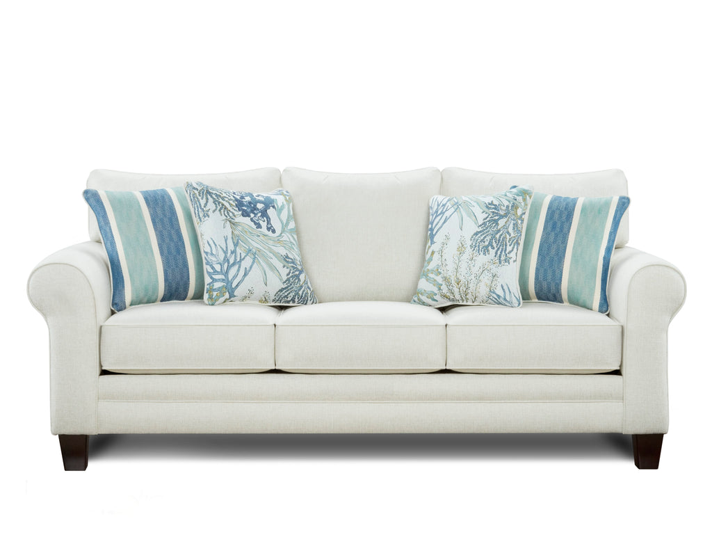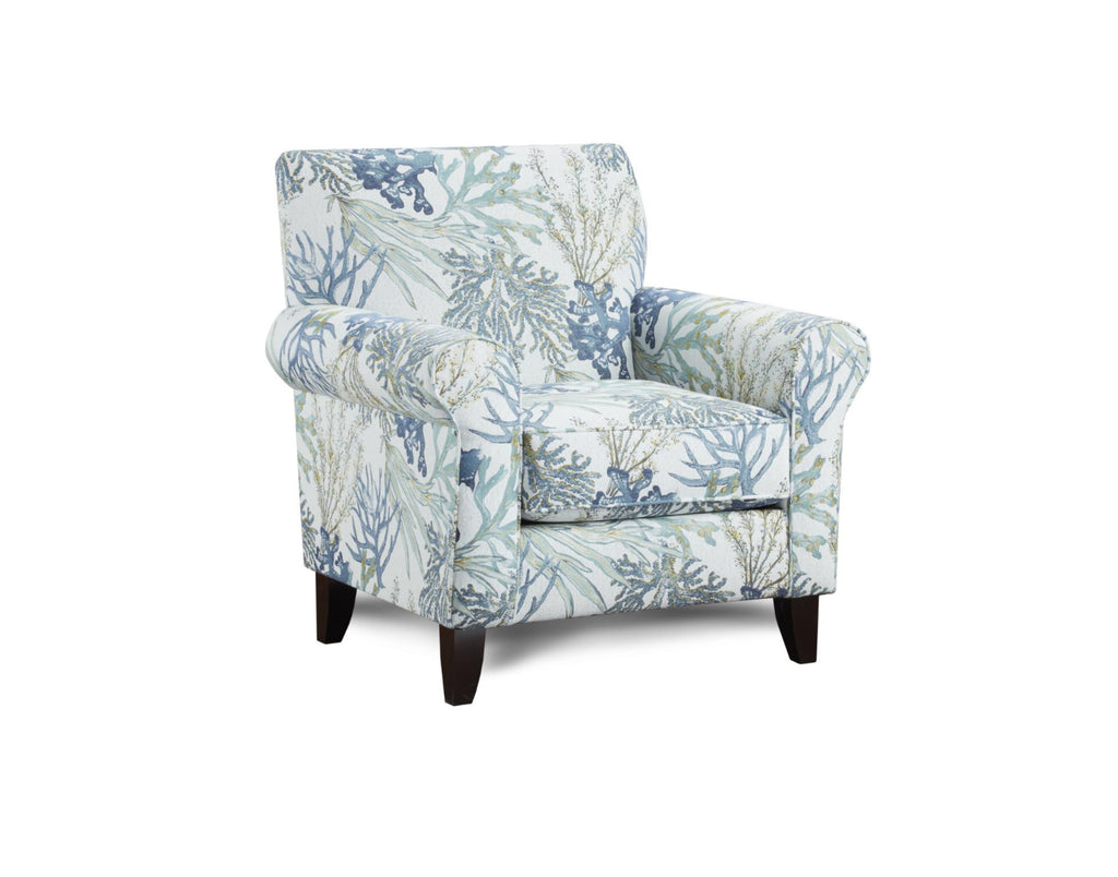 THE 1140 GRANDE GLACIER (REVOLUTION Fabric) Ocean colored blues and beachy colored coral reefs wisp over the crispy white background of our Grande Glacier Collection. Like peaceful waves calmly kiss the edge of the shore, so do the rolled arms to the outer edges of this silhouette. Tall, dark brown tapered legs perfectly accent the perimeter, while welt brings definition to the sweeping lines and contours. As your toes press into the cool, wet sand, calmness overshadows the outside world. Inhale, release!